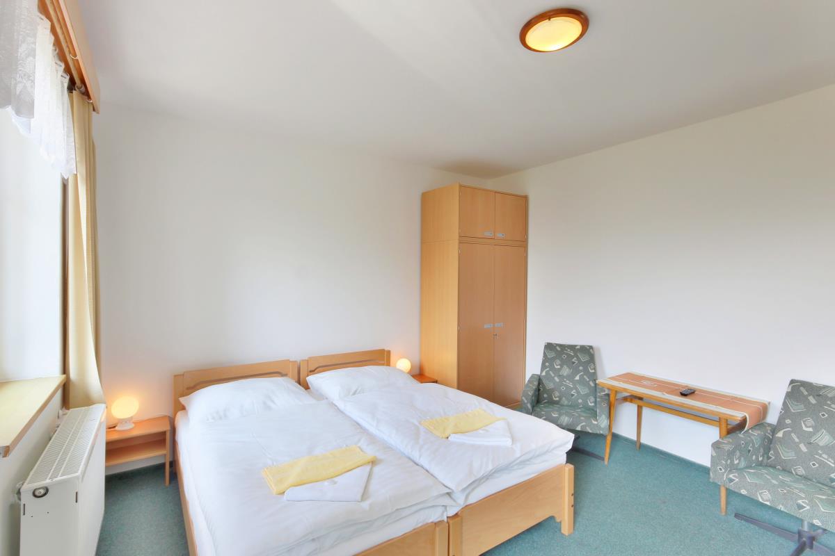 dvoulůžkové nebo třílůžkové pokoje, vybavené WC, sprchou , TV a Wi-Fi internetem.