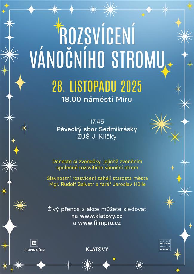 Slavnostní rozsvícení stromu začne 28. listopadu v 17:45 vystoupením sboru Sedmikrásky ZUŠ J. Kličky. V 18:00 jej rozsvítí starosta Rudolf Salvetr společně s farářem Jaroslavem Hůllem. Přineste si zvonečky — společně odstartujeme advent! 🔔✨