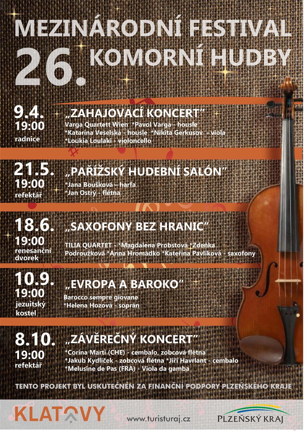 „Festival komorní hudby má v Klatovech dlouholetou tradici a každoročně přináší posluchačům výjimečné hudební zážitky v jedinečných historických prostorách města.“