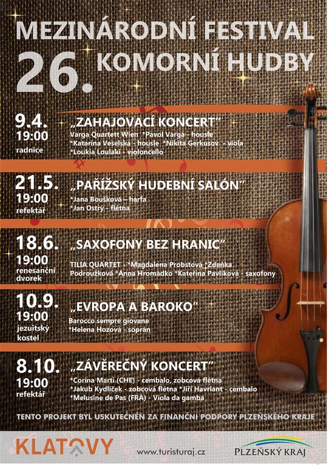 V Klatovech začíná ve čtvrtek 9. dubna již XXVI. ročník Mezinárodního festivalu komorní hudby. Prestižní hudební akce s dlouholetou tradicí se koná vždy od jara do podzimu na různých historických místech ve městě. V podání špičkových českých i zahraničních interpretů zazní skladby barokní i klasické hudby.