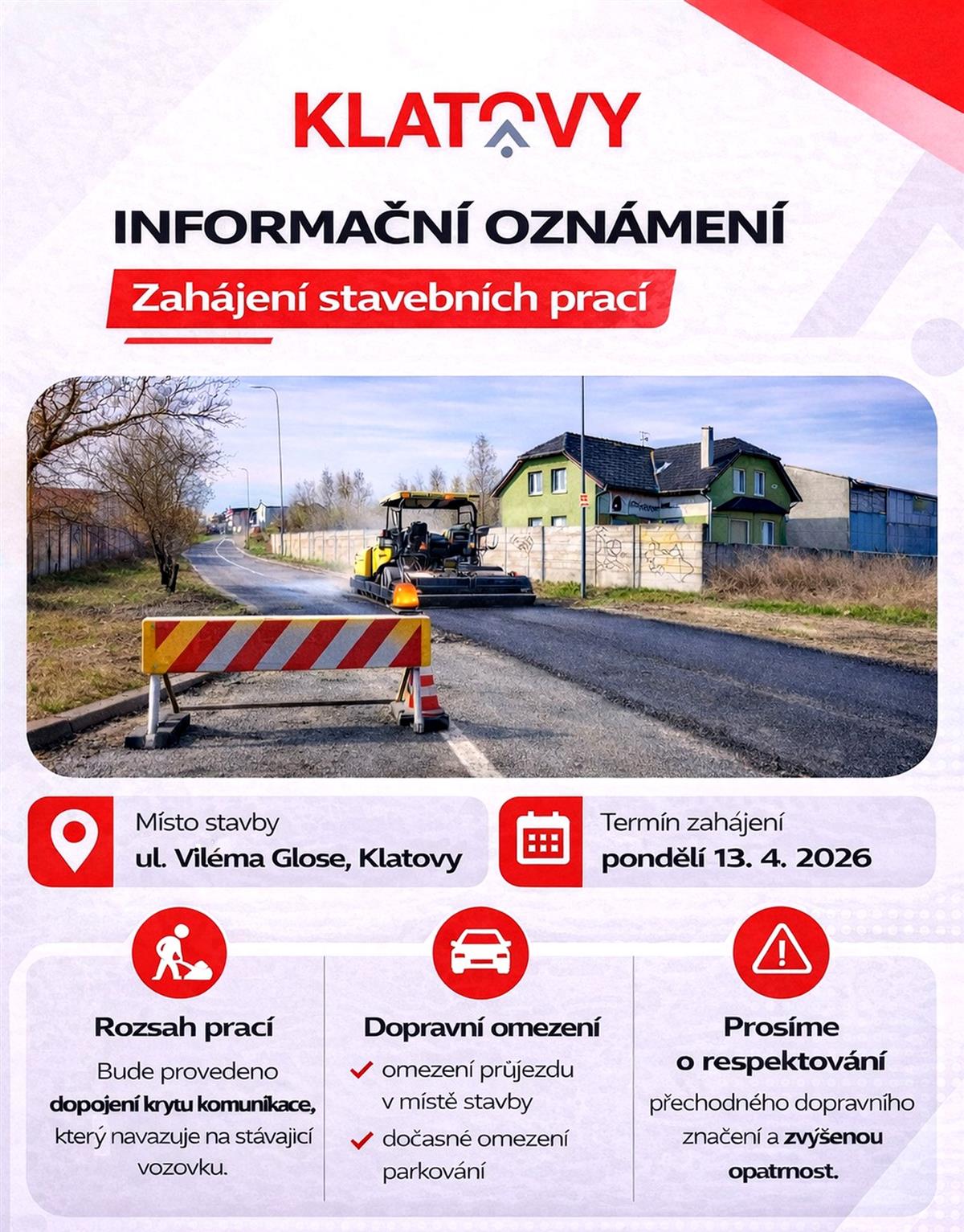 Město Klatovy informuje o zahájení stavebních prací v ulici Viléma Glose, které se týkají dopojení krytu komunikace. Práce začnou v pondělí 13. dubna 2026.