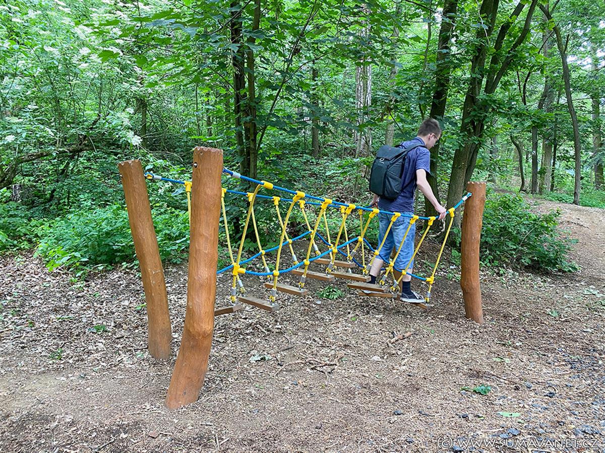 - žebřík, lanová síť a bariéra s otvory pro ruce a nohy slouží pro zdolávání překážek ve vertikální poloze, určeno především pro děti