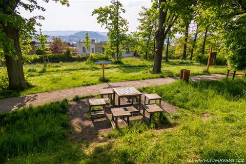 na Šumavu, orientaci umožňuje panoramatická mapa s popisem jednotlivých