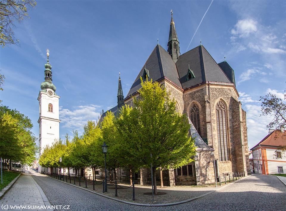 Byl postaven krátce po založení města, v druhé polovině 13.století. Tehdy to byla jediná celokamenná stavba uvnitř města. Kostel byl několikrát opravován a tak se do dnes z původní stavby dochovalo jen několik kamenných zlomků. Hlavní loď s klenbou v pozdně gotickém slohu pochází z let 1550-60 z dílny domácího stavitele Antonína Salnellyna. Po roce 1685 byl na oltář umístěn obraz Panny Marie Klatovské, spojený se zázrakem Panny Marie, která krev ronila a uzdravovala.