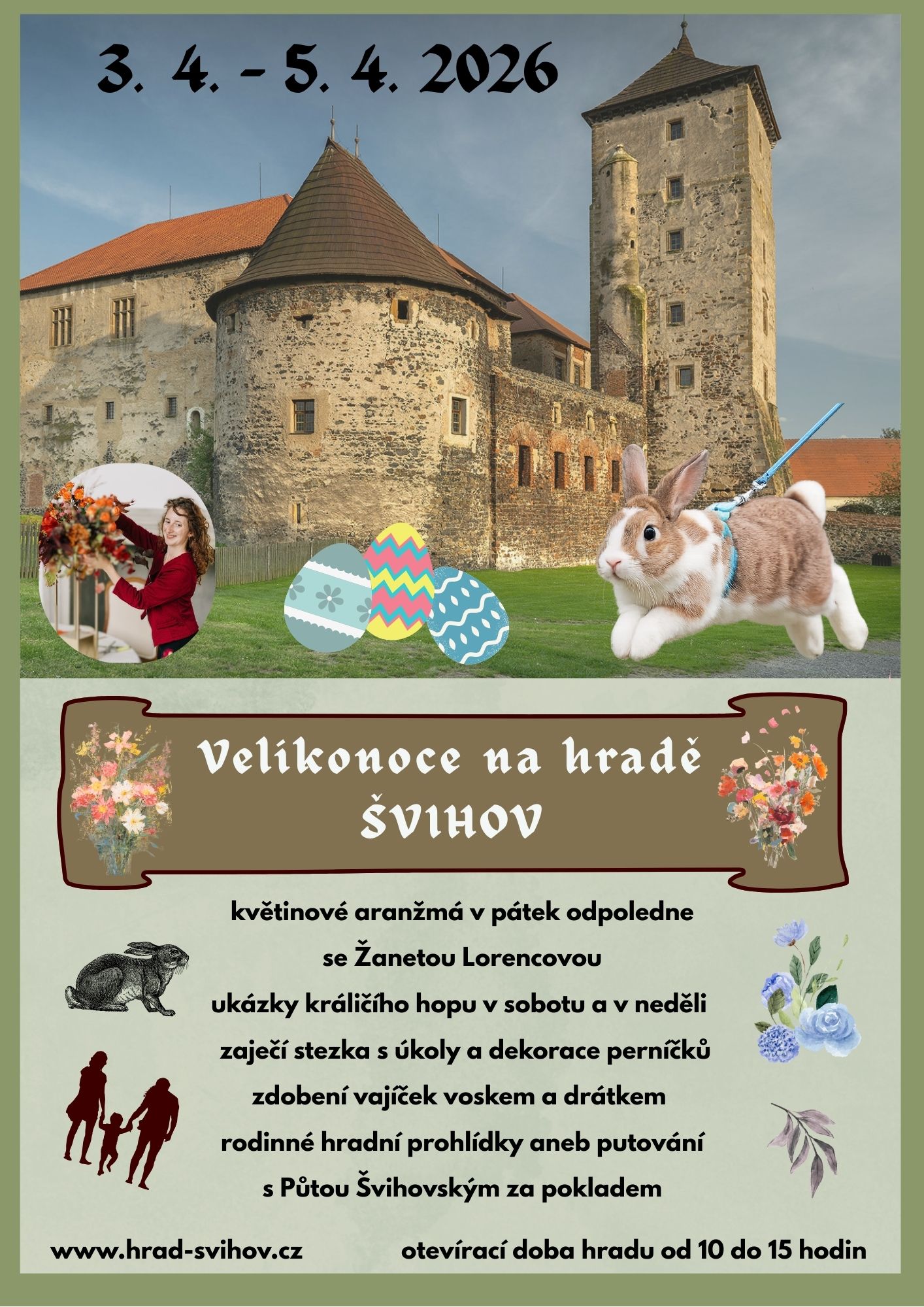 Probouzející se přírodu přivítáme s floristkou Žanetou Lorencovou. V pátek 3. dubna od 12 do 15 hodin ráda přiblíží zájemcům tvorbu květinového aranžmá. Vyzkoušejte si tuto techniku a vyzdobte příjemně svůj domov. Dozvíte se, jak správně kombinovat jarní květiny, barvy i přírodní materiály tak, aby váš příbytek získal tu pravou velikonoční atmosféru. Členky ze spolku chovatelů ČSCH z Plzně a Klatov představí o víkendu na hradním nádvoří zábavný sport Králičí HOP. Se svými chlupatými kamarády předvedou ukázky zajímavých soutěžních disciplín. Ušáci zvládnou skok přes překážky, do dálky i do výšky. V sobotu si můžete projít s dětmi zaječí stezku a plnit úkoly, vyzkoušet svoji šikovnost s vajíčkem i mrkvičkou, rychlost i paměť, procvičit si znalosti u luštění hradního kvízu a hádanky. V neděli se můžete naučit malovat vajíčka voskem pod vedením lektorek Milady a Boženy. Sladkou odměnou bude velikonoční perníček v hradním bistru. Srdečně zveme. (Zapsal: Státní hrad Švihov, 03.03.26) | ||