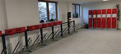 Úschovna kol a koloběžek, nabíječky, uzamykatelné skříňky na osobní věci, WC, sprcha, přebalovací pult.