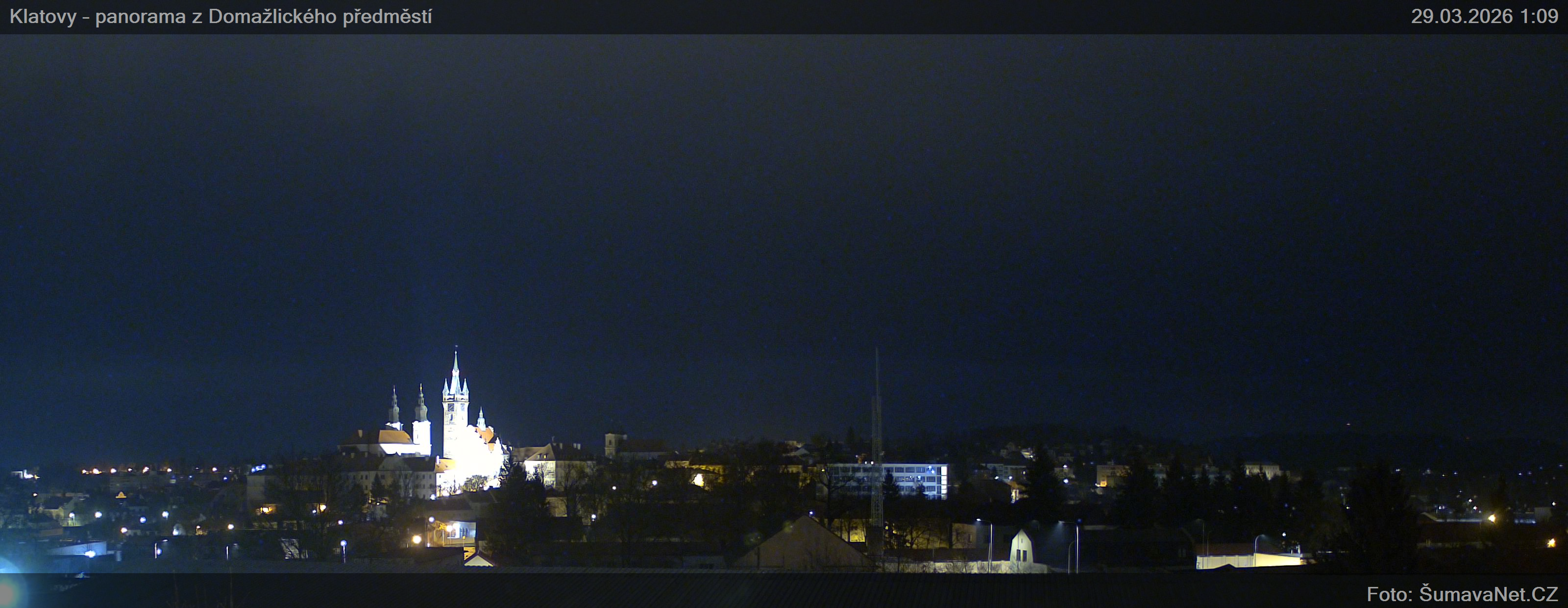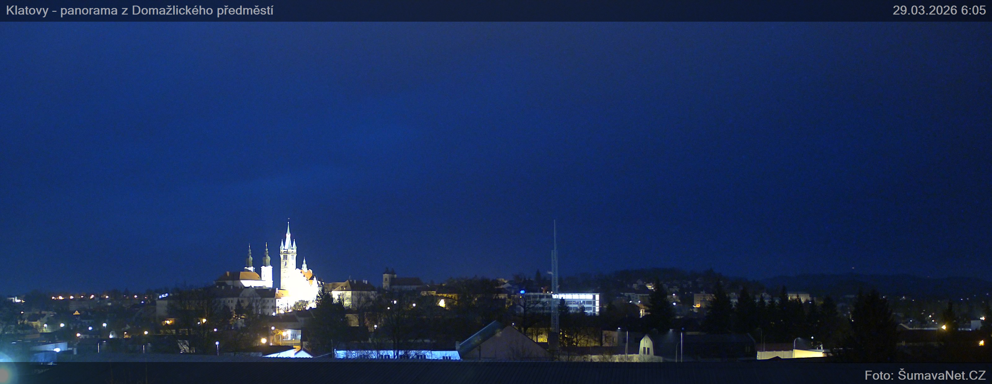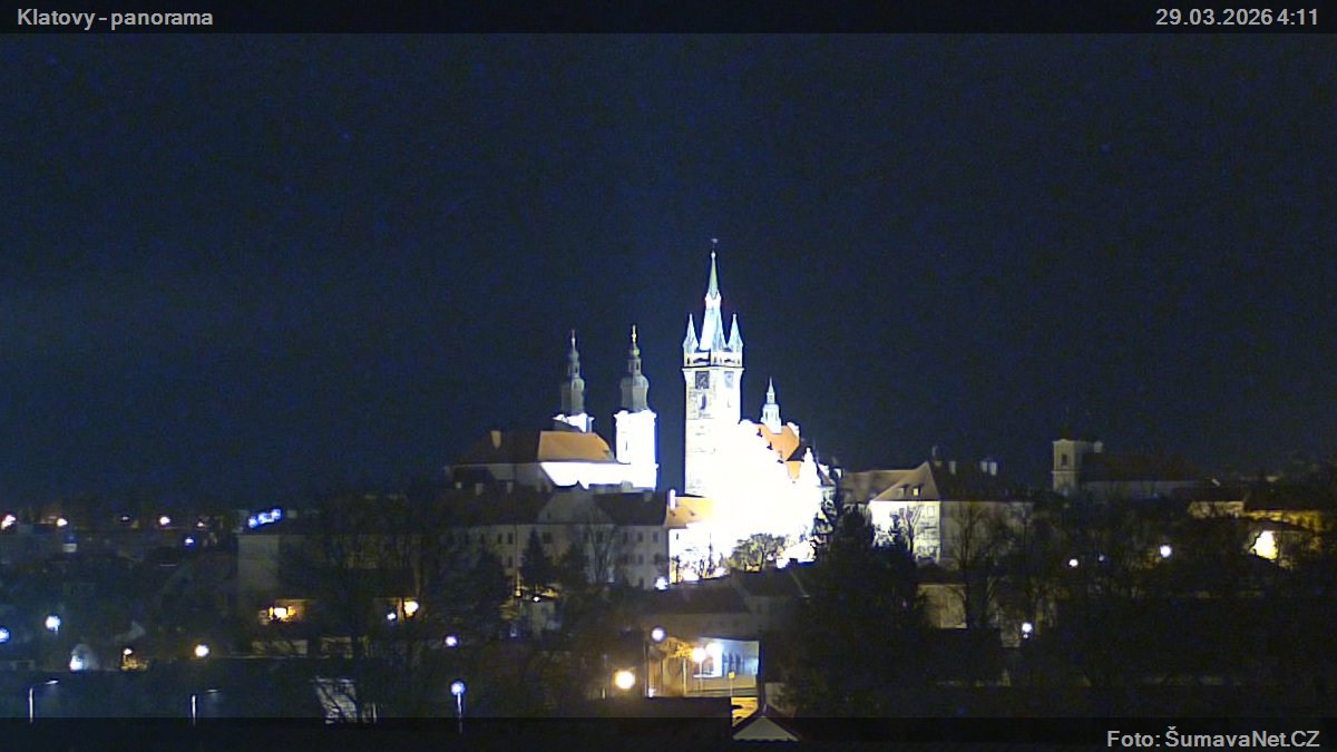 Obsah stránkyWebKameryKlatovy – náměstíVelký obrázek28.03.2026 23:24:35Vyberte čas: Archiv: Dnes 1 den 2 dny týden měsíc 100 dnů rok Panorama z Domažlického předměstíVelký obrázek28.03.2026 23:24:34Vyberte čas: Archiv: Dnes 1 den 2 dny týden měsíc 100 dnů rok Panorama – detailVelký obrázek28.03.2026 23:24:42Vyberte čas: Znovunačtení stránky - Refresh pagePoznámka: pokud se některý z obrázků nenačte celý, právě se nahrává z kamerky na internet. Klikněte prosím na odkaz - Znovunačtení stránky