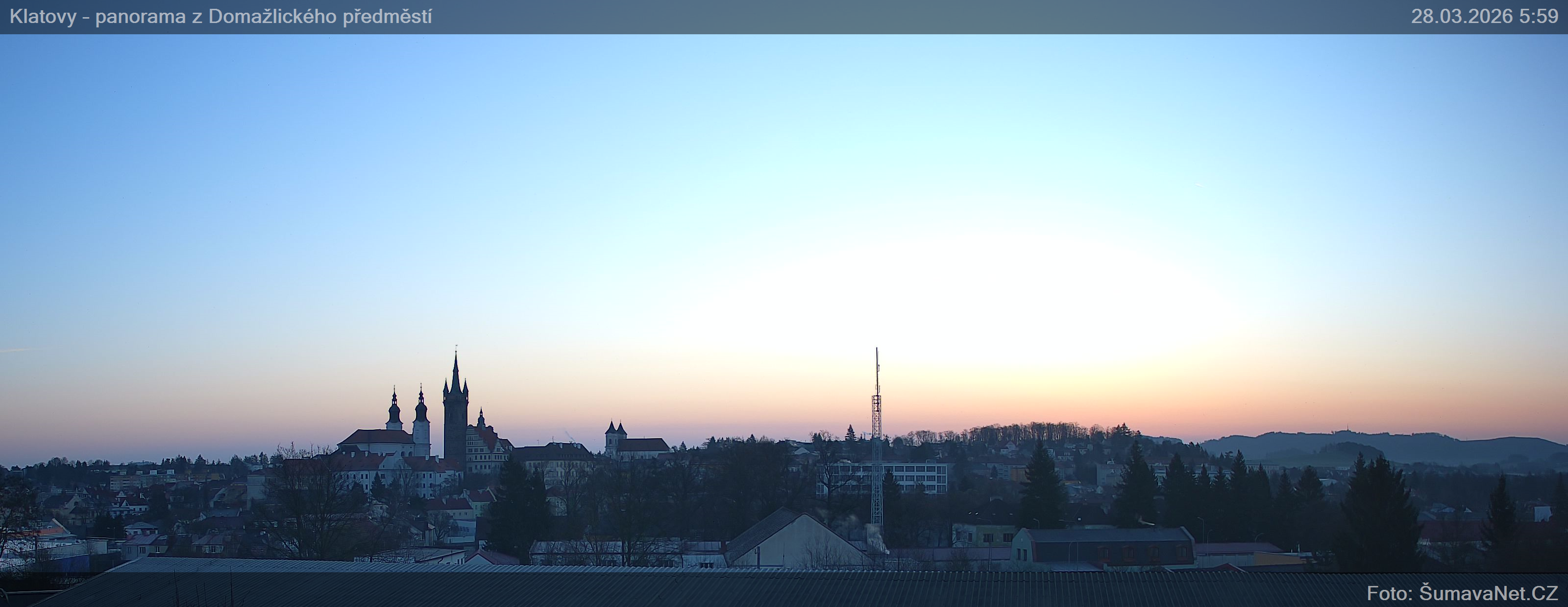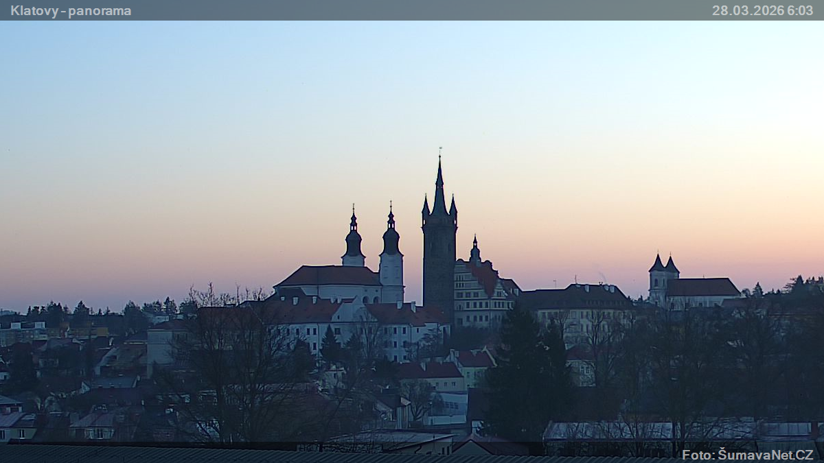 Page contentWebCamsKlatovy – náměstíBig Image28.03.2026 3:59:32Select time: Archive: Today 1 day 2 days Week Month 100 days Year Panorama z Domažlického předměstíBig Image28.03.2026 3:58:08Select time: Archive: Today 1 day 2 days Week Month 100 days Year Panorama – detailBig Image28.03.2026 3:58:16Select time: Refresh page