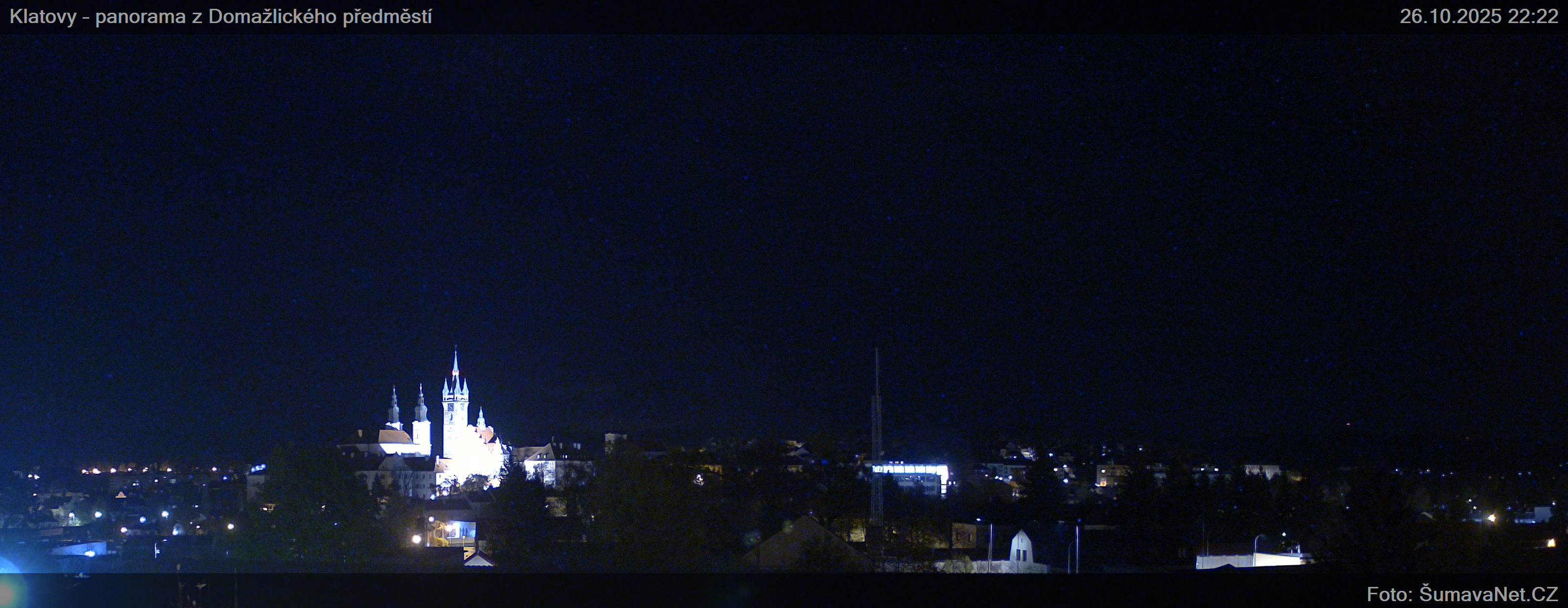 Page contentWebCamsKlatovy – náměstíBig Image26.10.2025 19:59:17Select time: Archive: Today 1 day 2 days Week Month 100 days Year Panorama z Domažlického předměstíBig Image26.10.2025 19:58:47Select time: Archive: Today 1 day 2 days Week Month 100 days Year Panorama – detailBig Image26.10.2025 19:59:12Select time: Refresh page