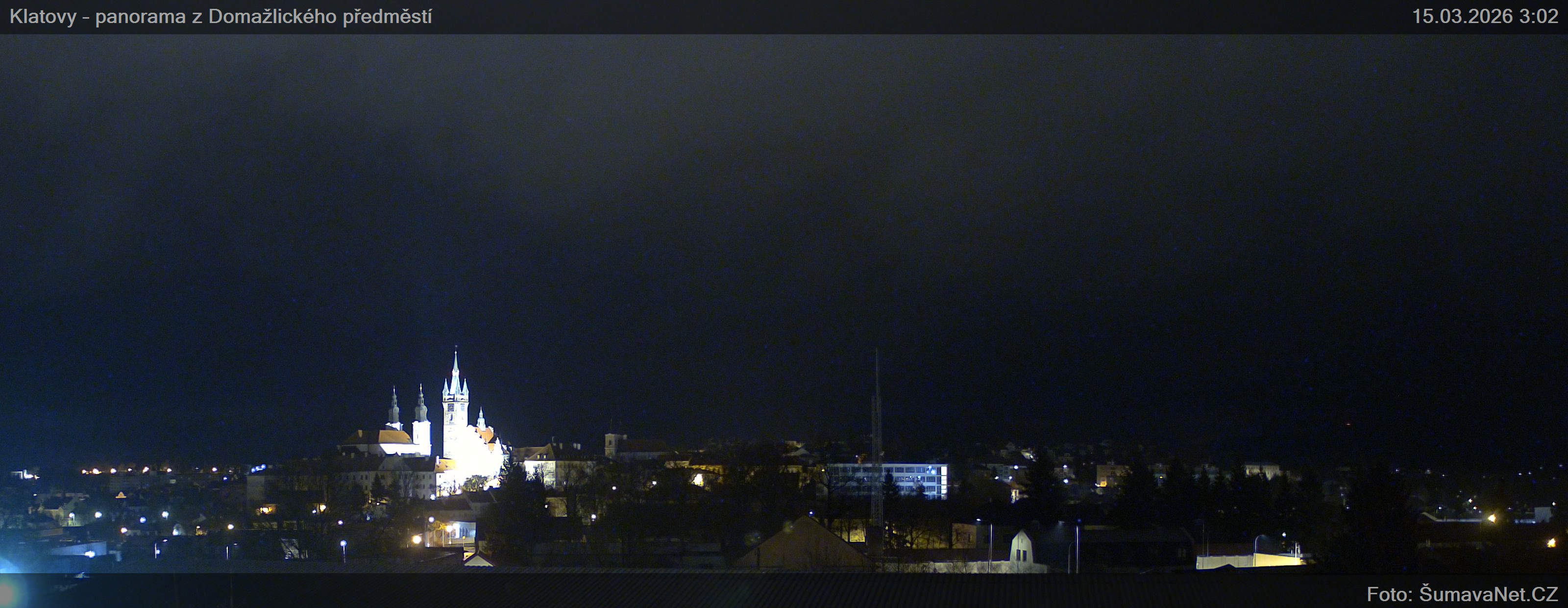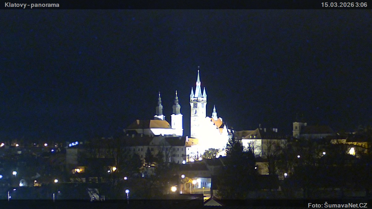 Page contentWebCamsKlatovy – náměstíBig Image16.01.2026 18:57:43Select time: Archive: Today 1 day 2 days Week Month 100 days Year Panorama z Domažlického předměstíBig Image16.01.2026 18:57:03Select time: Archive: Today 1 day 2 days Week Month 100 days Year Panorama – detailBig Image16.01.2026 18:57:00Select time: Refresh page