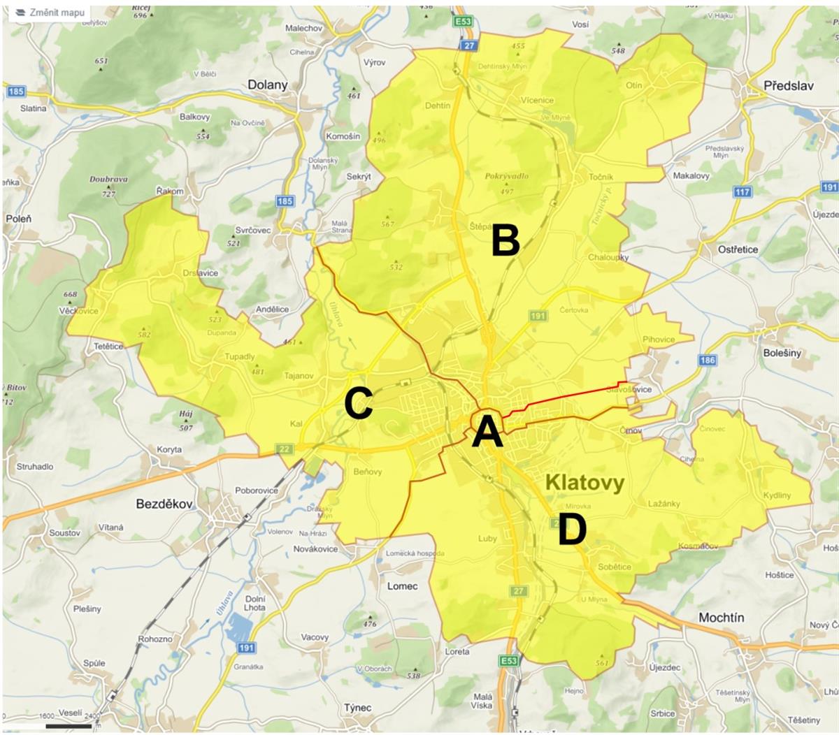 Rozdělení Klatov na jednotlivé okrsky: