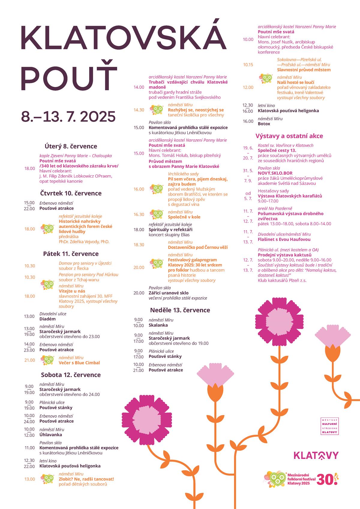 Srdečně vás zveme na tradiční Klatovskou pouť, která se uskuteční od úterý 8. do neděle 13. července 2025. Těšit se můžete na bohatý program plný hudby 🎶, tance 💃, výstav 🖼️, řemeslných trhů 🛍️ a pouťových atrakcí 🎡.