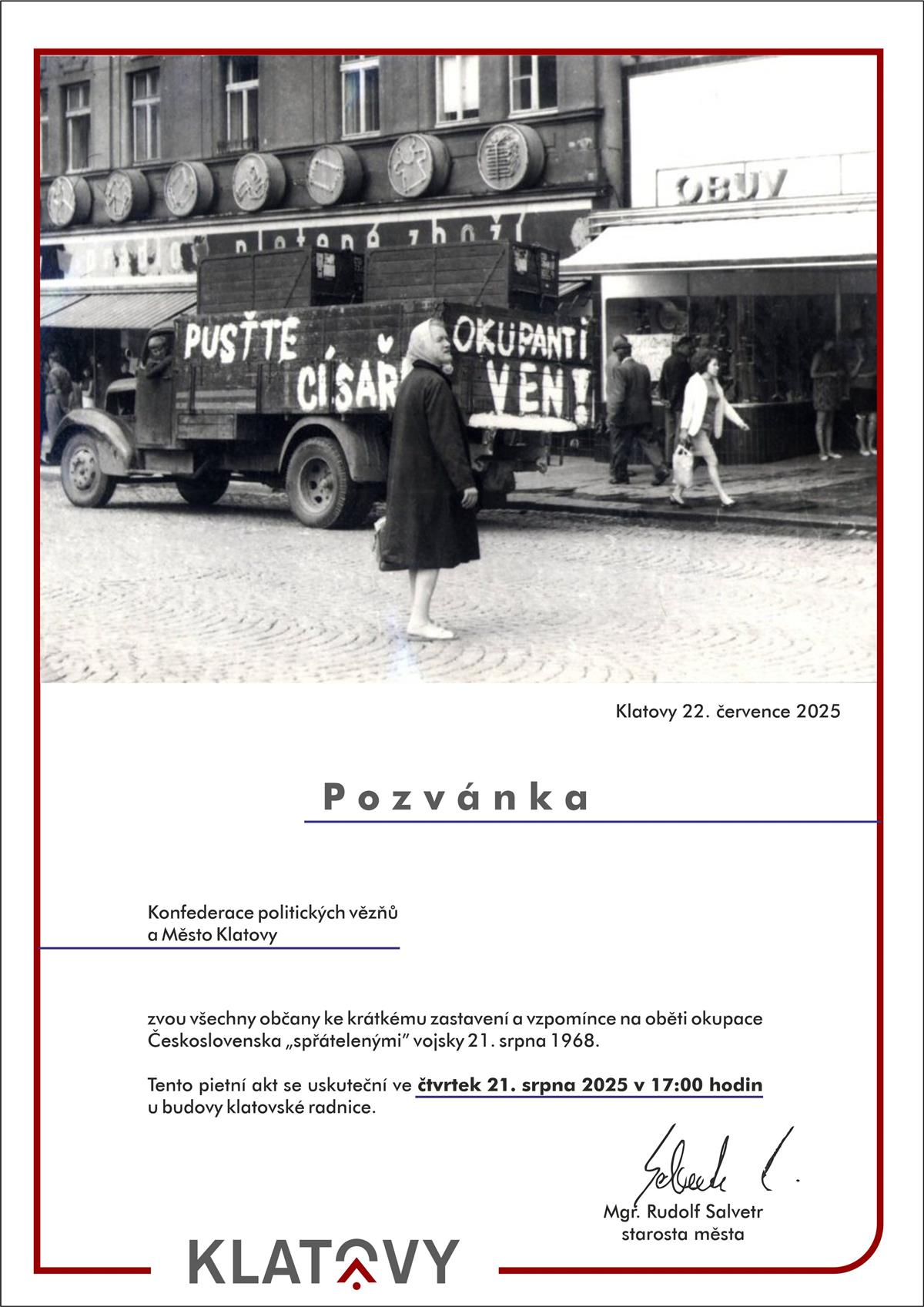 Město Klatovy společně s Konfederací politických vězňů zve všechny občany ke krátkému zastavení a tiché vzpomínce na oběti okupace Československa vojsky „spřátelených“ armád dne 21. srpna 1968.