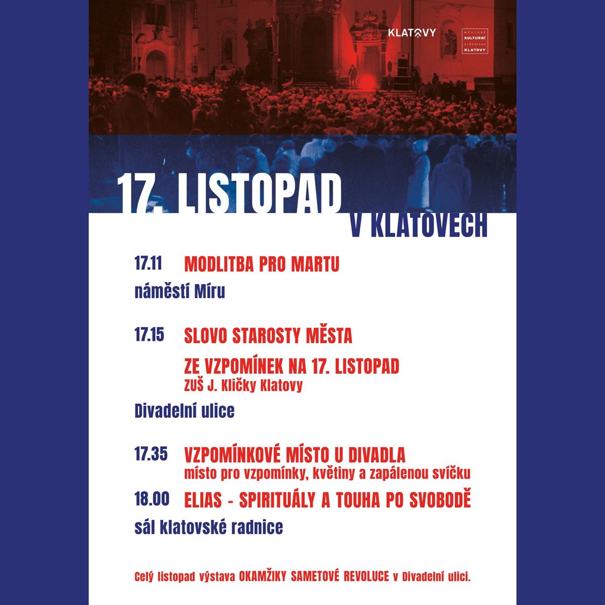 🕔 17:15 – Slovo starosty města a vzpomínky na 17. listopad + ZUŠ J. Kličky Klatovy