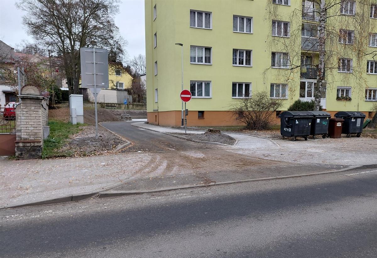 V rámci stavebních prací došlo k obnově vozovky, vybudování nového chodníku, parkovacích stání a také nového schodiště. Komunikace zůstává jednosměrná. 🔧🧱➡️
