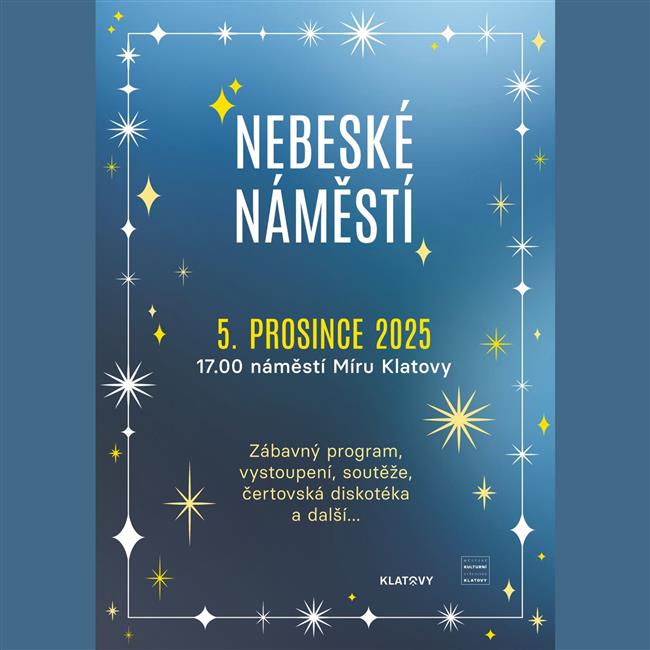 V pátek 5. prosince od 17.00 hodin začíná na klatovském náměstí akce pod názvem Nebeské náměstí aneb…… Těšit se můžete na tanec, divadlo, diskotéku 💫🕺💃 a samozřejmě chybět nebudou čerti s Mikulášem 😈👼.