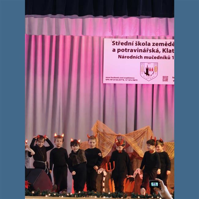 Hned v úvodu vystoupily děti z klatovské mateřské školy Singerova vila převlečené za čertíky a andílky 😇😈. Všechny přítomné pak přivítali a krásný první advent popřáli místostarosta města Klatovy Martin Kříž, vedoucí odboru školství, kultury a cestovního ruchu Alena Kunešová a ředitel Střední školy zemědělské a potravinářské Vladislav Smolík.
