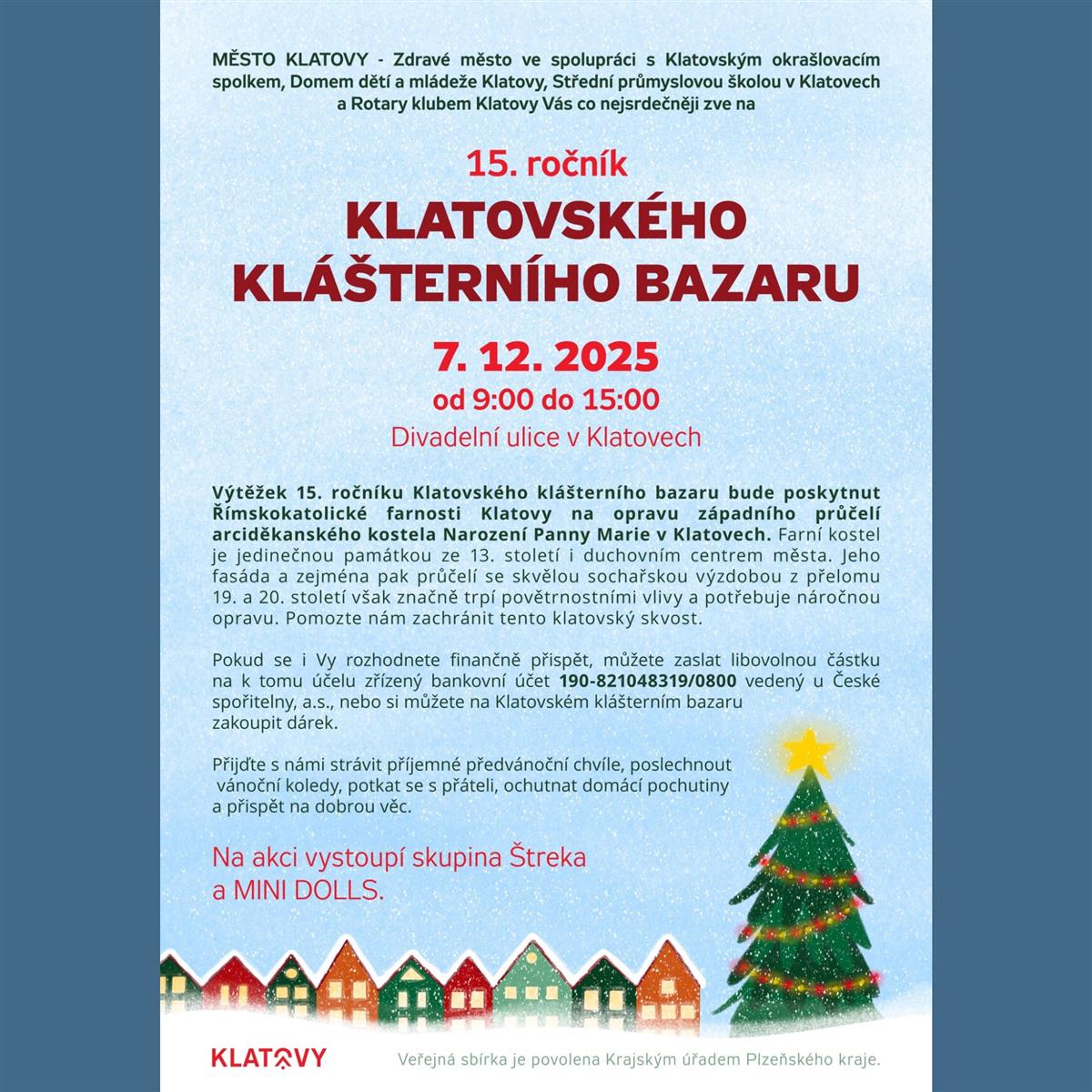V neděli 7. prosince je pak na programu od 9.00 hodin v Divadelní ulici Klatovský klášterní bazar 🧺✨ a na náměstí Míru je první adventní trh s odpoledním a večerním programem.