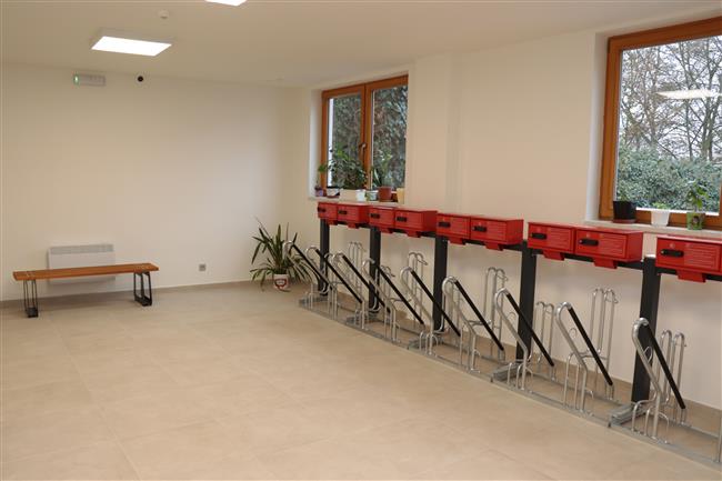 V nové úschovně kol je k dispozici více než pět desítek uzamykatelných stání, z toho 14 z nich s možností nabíjení elektrokol. Úschovna kol je otevřeným prostorem monitorovaným kamerou. Cyklisté zde najdou nejen uzamykací skříňky, ale i uzamykatelné šatní boxy pro uložení menších zavazadel. A také servisní set pro drobné opravy jízdních kol, či možnost dofouknutí pneumatik. Nové veřejné WC, které je součástí objektu, je rozděleno na pánské a dámské toalety, nechybí ani WC pro invalidy. Jsou zde i sprchy a přebalovací pult.