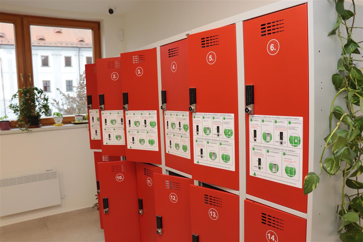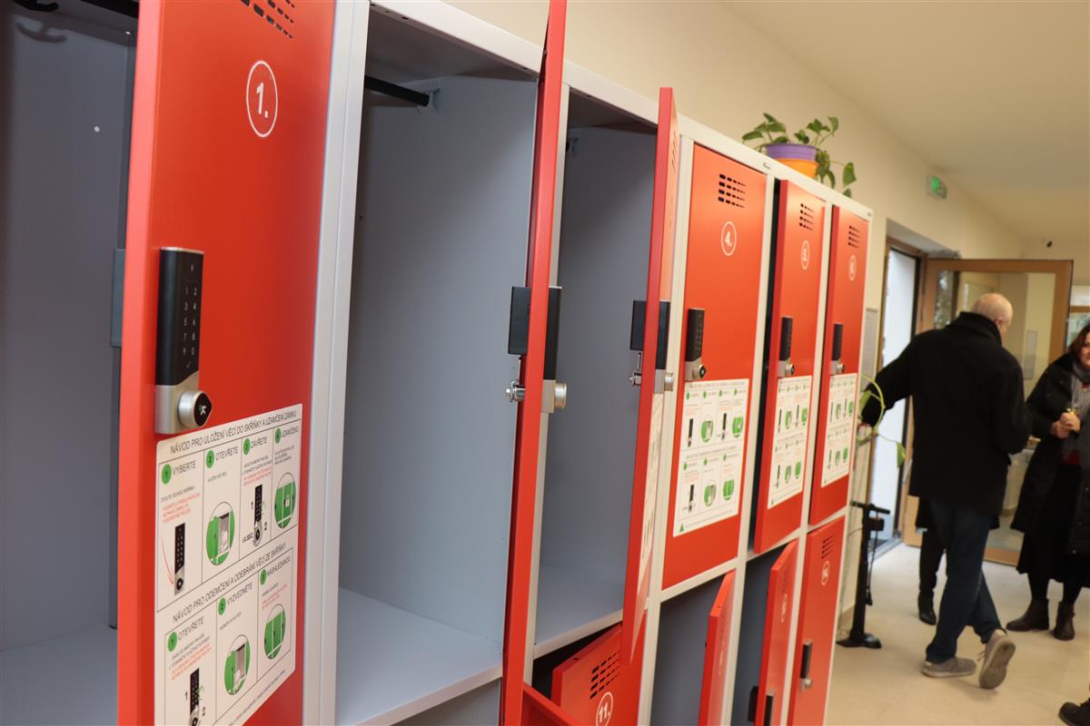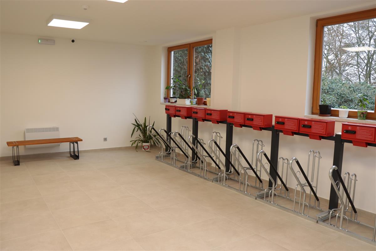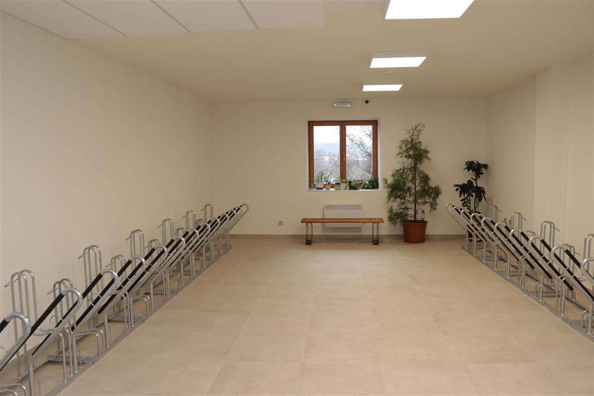 V nové úschovně kol je k dispozici více než pět desítek uzamykatelných stání, z toho 14 z nich s možností nabíjení elektrokol. Úschovna kol je otevřeným prostorem monitorovaným kamerou. Cyklisté zde najdou nejen uzamykací skříňky, ale i uzamykatelné šatní boxy pro uložení menších zavazadel. A také servisní set pro drobné opravy jízdních kol, či možnost dofouknutí pneumatik. Nové veřejné WC, které je součástí objektu, je rozděleno na pánské a dámské toalety, nechybí ani WC pro invalidy. Jsou zde i sprchy a přebalovací pult.