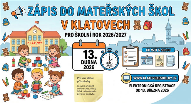 📢 ZÁPIS DO MATEŘSKÝCH ŠKOL V KLATOVECH pro školní rok 2026/2027 📢