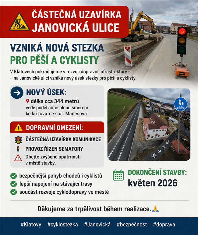 „Výstavba stezky v Janovické ulici je dalším krokem ke zlepšení podmínek pro pěší i cyklisty a zvýšení bezpečnosti dopravy ve městě.“