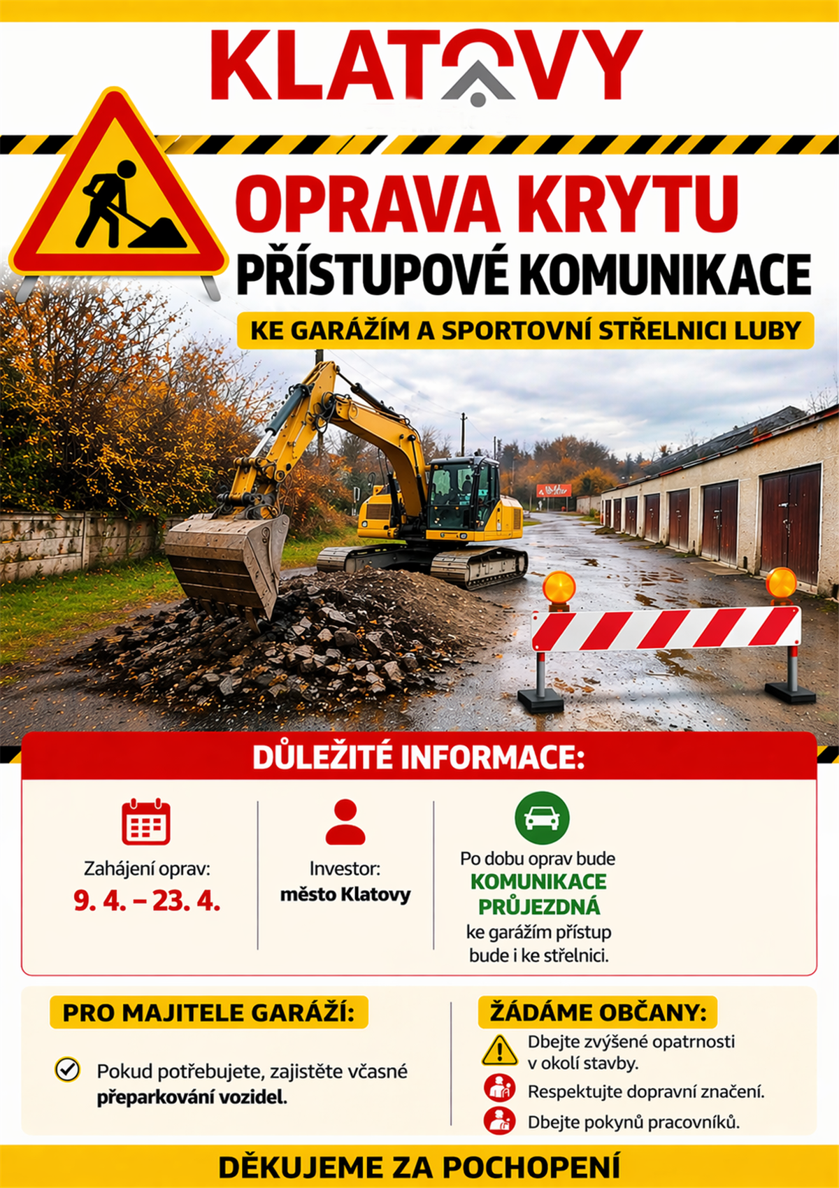 Město Klatovy informuje o plánované opravě přístupové komunikace v lokalitě Luby, která vede ke garážím a střelnici. Stavební práce budou probíhat od 9. do 23. dubna 2026.