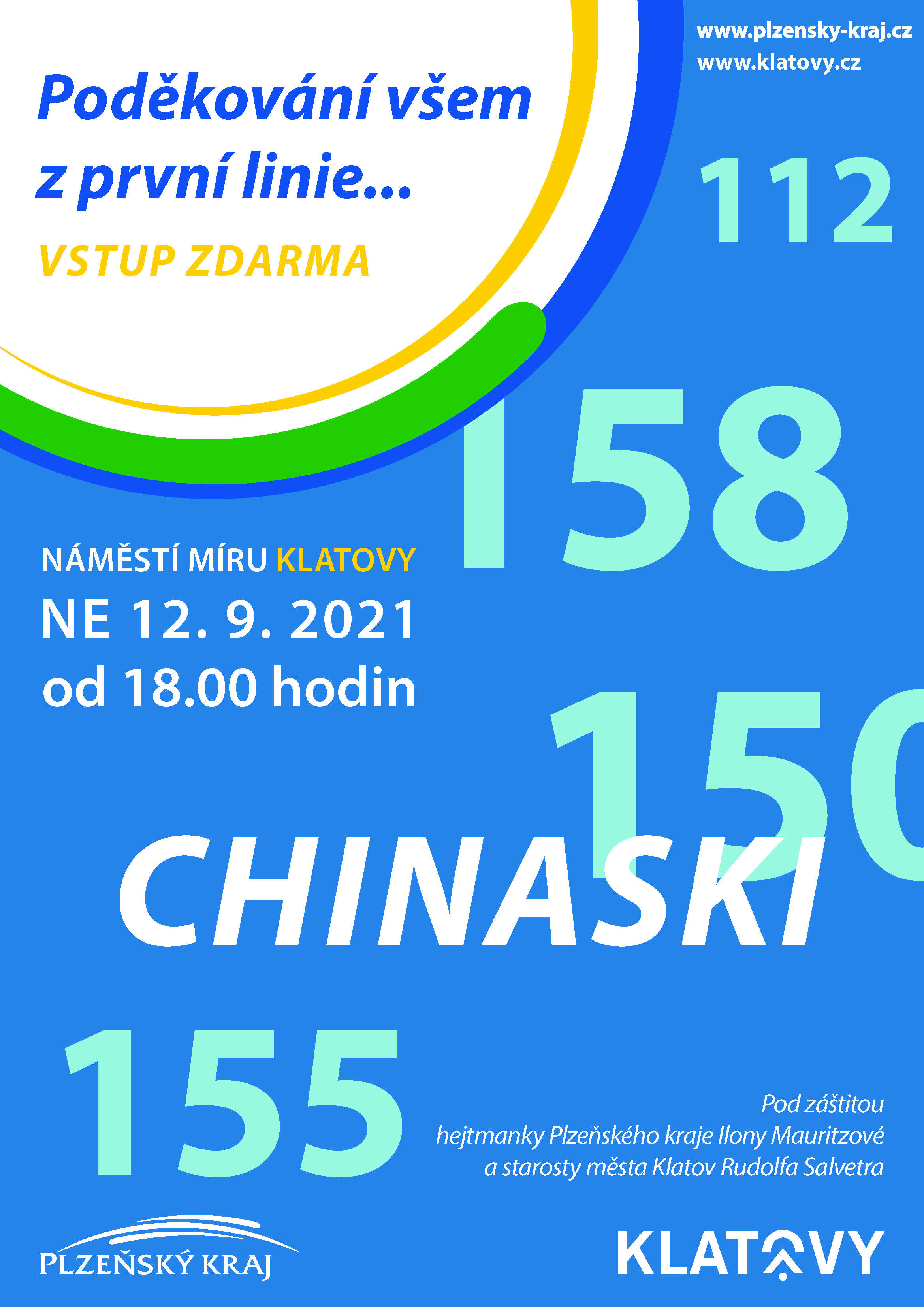 Do Klatov zamíří oblíbená česká popová skupina Chinaski. Hudební vystoupení se uskuteční 12. září 2021 na náměstí Míru od 18 hodin. Touto akcí chce Plzeňský kraj společně s Městem Klatovy poděkovat všem hrdinům z první linie v době koronavirové krize. Připomeneme si tak, že tito lidé neváhají riskovat své zdraví i životy v době, kdy virus ohrožuje celý náš svět. Koncert skupiny Chinaski - Poděkování všem z první linie je zdarma a přijít může úplně každý. Těšíme se na Vás.