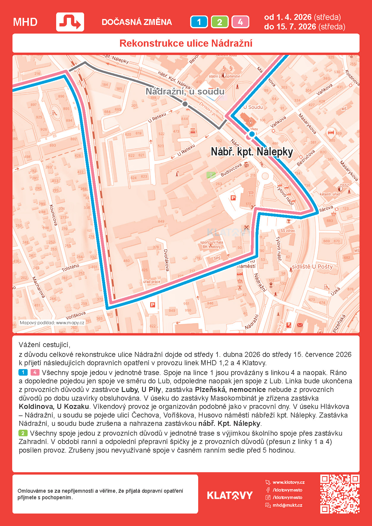 Aktuální jízdní řády MHD v Klatovech - POZOR - od 01.04.do 15.07.2026 - výlukové jízdní řády