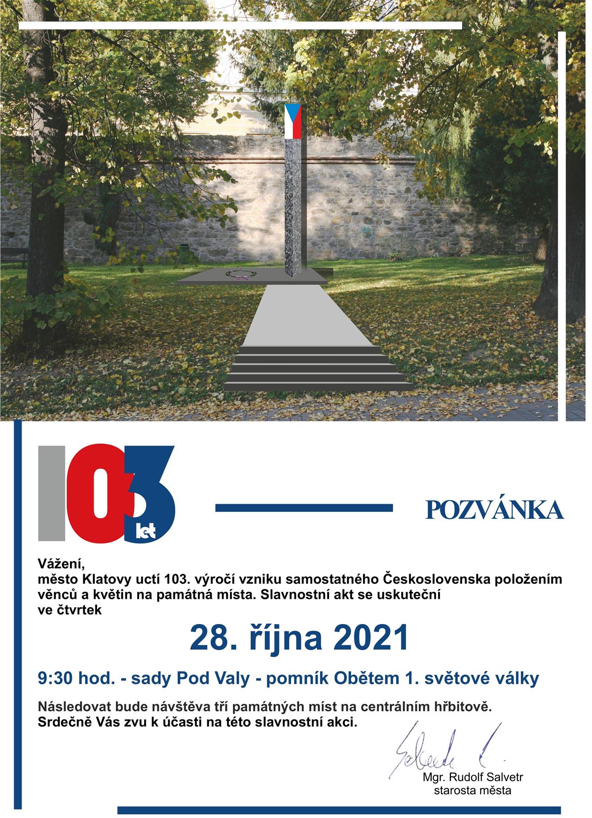 Obsah stránkyPozvánku na pietní akt u příležitosti 103. výročí vzniku samostatného ČeskoslovenskaSubmenu Návrat na předchozí stránku