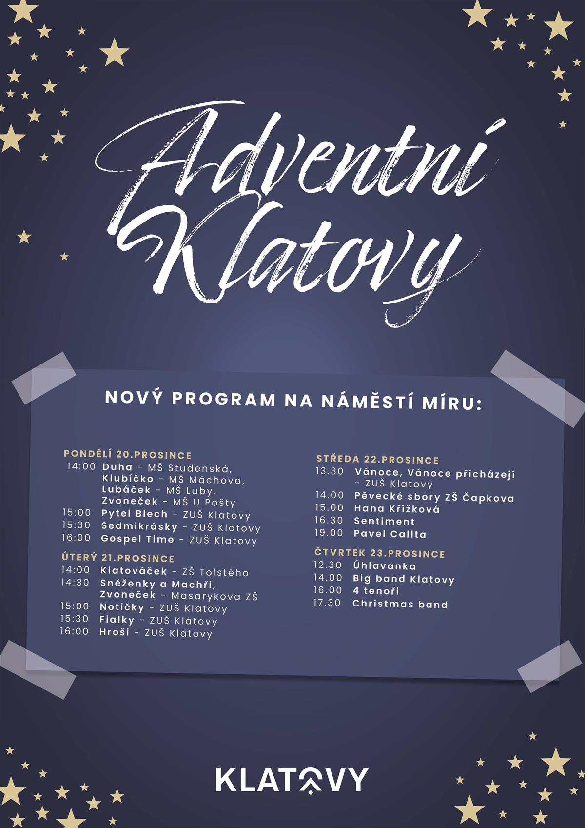 Obsah stránkyAdvent na klatovském náměstíSubmenuOd pondělí 20. do čtvrtka 23. prosince se můžete těšit na vánoční farmářské trhy s doprovodným programem. Žádáme návštěvníky o dodržování sociálního odstupu. Návrat na předchozí stránku