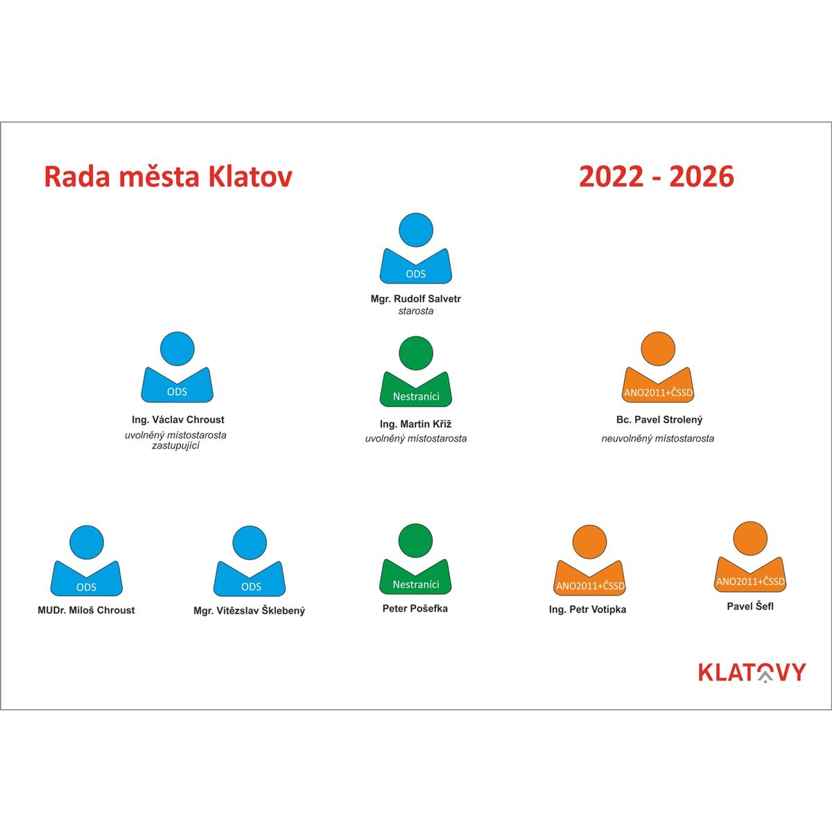 V pondělí 24. října 2022 od 19:00 hodin proběhlo ve velkém sále Kulturního domu v Klatovech ustavující zasedání zastupitelstva města. Na tomto jednání byl zvolen starostou města Klatov Rudolf Salvetr, zastupující místostarosta Václav Chroust, místostarosta Martin Kříž a místostarosta Pavel Strolený. Václav Chroust a Martin Kříž budou vykonávat tuto funkci jako uvolnění a Pavel Strolený jako neuvolněný. Do devítičlenné Rady města byli zvoleni Miloš Chroust, Vítězslav Šklebený, Petr Votípka, Pavel Šefl, Peter Pošefka a již zmiňovaný starosta a místostarostové. Předposledním bodem na zasedání byla volba předsedů Kontrolního a Finančního výboru. Předsedkyní Kontrolního výboru se stala Kateřina Vágnerová a předsedou Finančního výboru Ján Ridzoň.