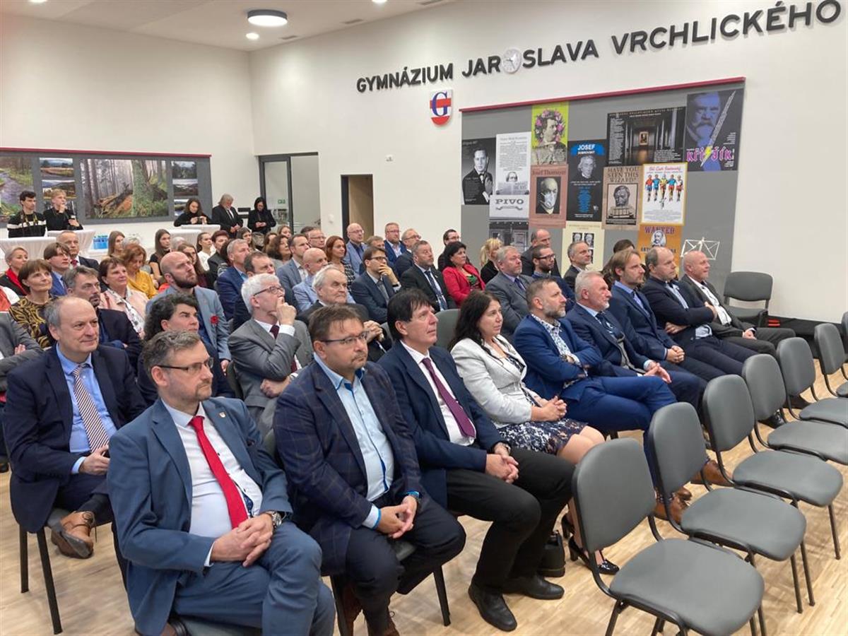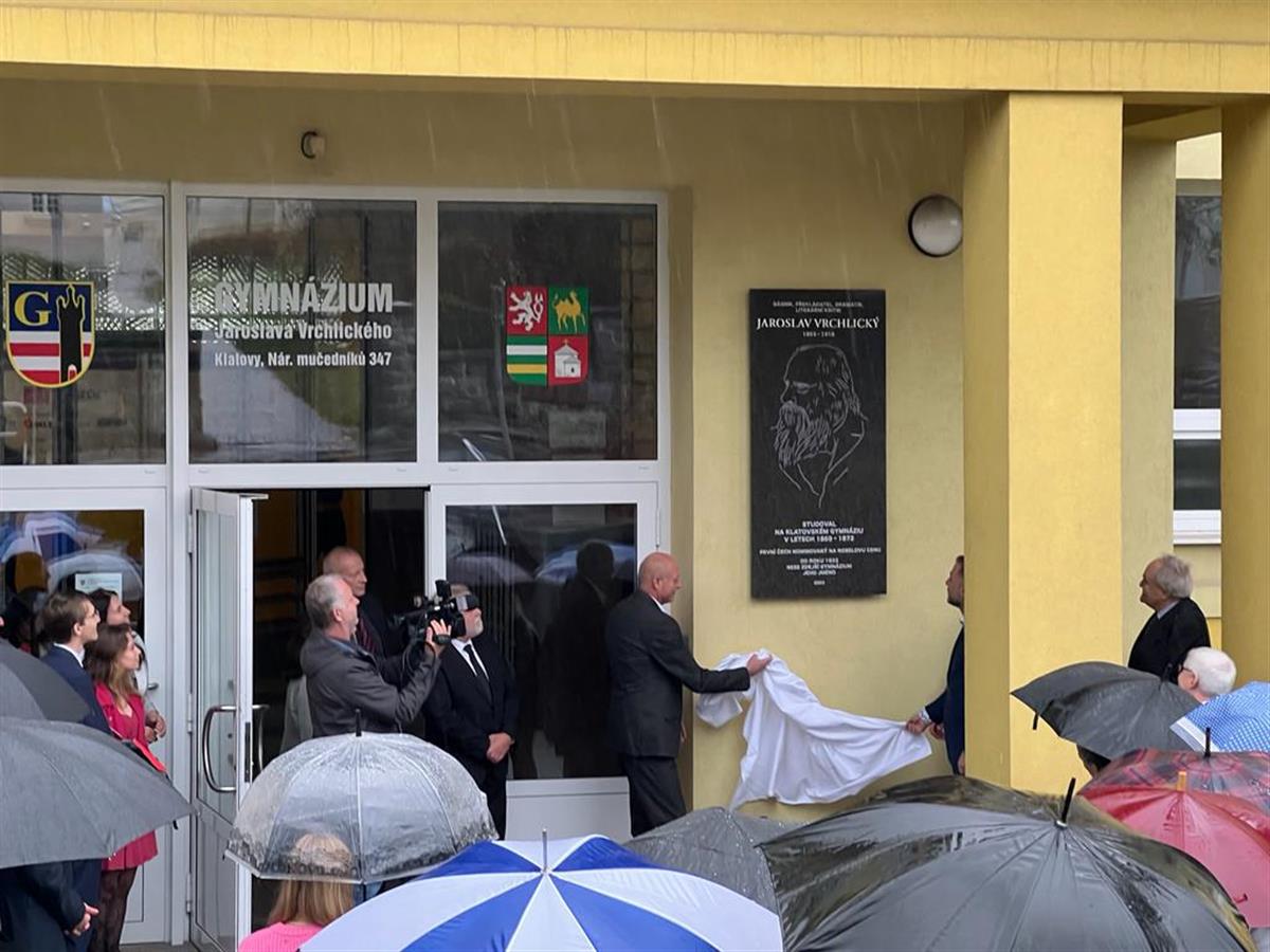 S historií i přítomností školy a jejím dalším směrování přítomné seznámil ředitel školy Mgr. Václav Vogeltanz. Hezkou tečkou dopoledního programu bylo slavnostní odhalení pamětní desky Jaroslavu Vrchlickému, jejímž autorem je klatovský sochař Václav Fiala.