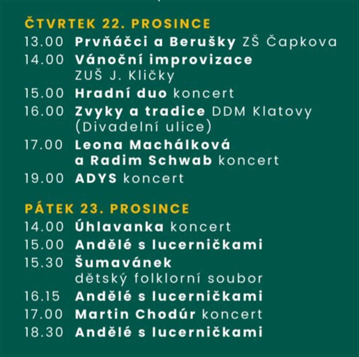 V pátek 23. prosince se od 14:00 hodin můžete těšit na koncert kapely Úhlavanka, od 15:30 vystoupí dětský folklórní soubor Šumavánek. Celý 13 denní adventní program zakončí koncertem s názvem "Hlas vánoc" populární zpěvák Martin Chodúr s kapelou.