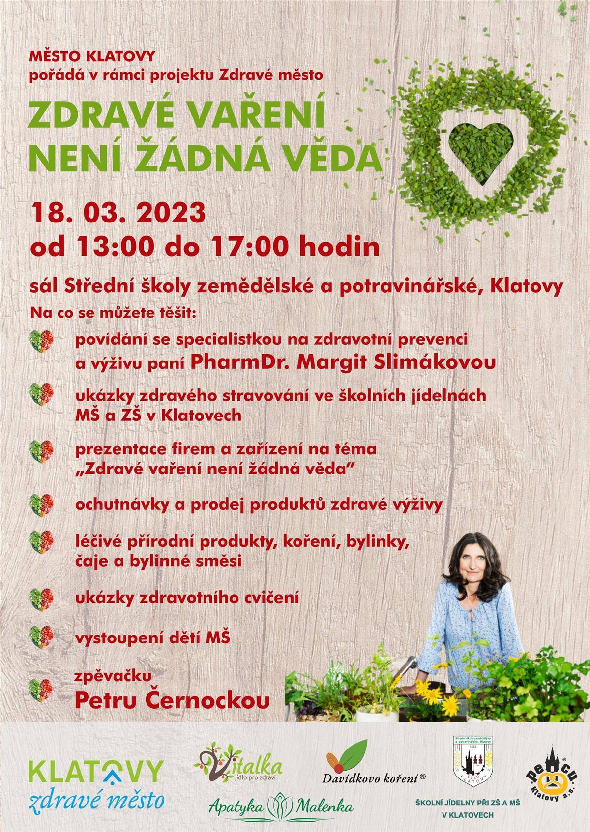 Město Klatovy pořádá v rámci projektu Zdravé město akci s názvem "Zdravé vaření není žádná věda". Můžete se těšit na povídání se specialistkou na zdravotní prevenci a výživu PharmDr. Margit Slimákovou, ukázky zdravého stravování a zdravotního cvičení a další. Na akci zazpívá Petra Černocká.