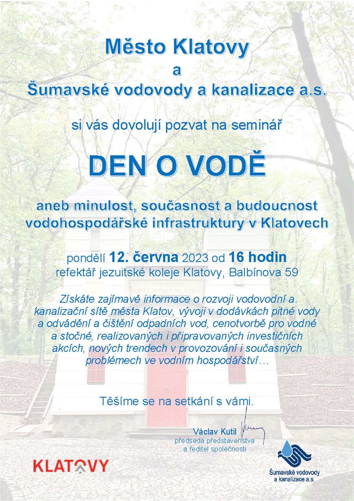 Město Klatovy a Šumavské vodovody a kanalizace a.s. si Vás dovolují pozvat na seminář "Den o vodě" aneb minulost, současnost a budoucnost vodohospodářské infrastruktury v Klatovech. Seminář proběhne v pondělí 12. června 2023 od 16:00 hodin v refektáři jezuitské koleje v Klatovech (Balbínova 59). Dozvíte se zajímavé informace o rozvoji vodovodní a kanalizační sítě města Klatov, vývoji v dodávkách pitné vody a odvádění a čištění odpadních vod, cenotvorbě pro vodné a stočné, realizovaných a připravovaných investičních akcích, nových trendech v provozování i současných problémech ve vodním hospodářství.