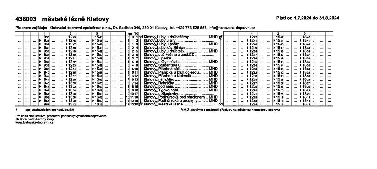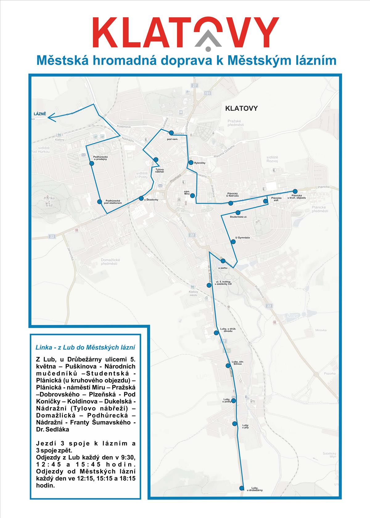 Od pondělí 1. července bude, stejně jako v loňském roce, posílena městská hromadná doprava 🚌 o linku č. 3 k Městským lázním 🏊♀️, a to po dobu letních prázdnin. Tuto linku obslouží dopravce minibusem v časech celkem třikrát dopoledne k lázním a třikrát odpoledne zpět směrem do Lub viz. jízdní řád. Pro využití linky nově platí aktuálně platný tarif MHD, tato přeprava bude zpoplatněna částkami