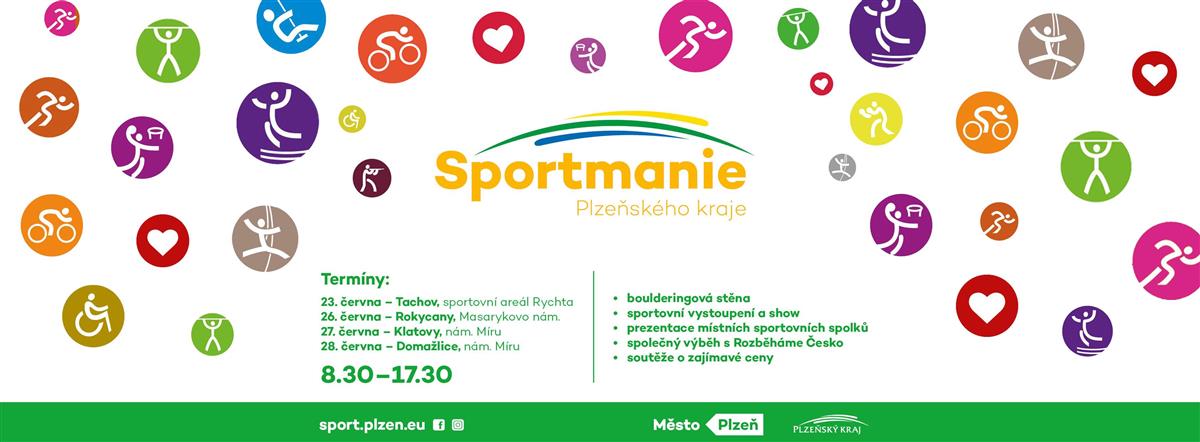 Přijďte s námi rozhýbat svá těla a užít si den plný sportu pro celou rodinu. Zveme vás na Roadshow Sportmanie Plzeňského kraje. V úterý 27. 6. za vámi přijedeme do Klatov na náměstí Míru. Připraven bude bohatý sportovní i doprovodný program. Těšit se můžete na prezentaci místních klubů, vodní skluzavku , vystoupení, soutěže a speciální běh od Rozběháme Česko. Máte se na co těšit. Tak dorazte v úterý 27. 6. na náměstí Míru na Roadshow Sportmanie Plzeňského kraje. Začínáme v 8:30!