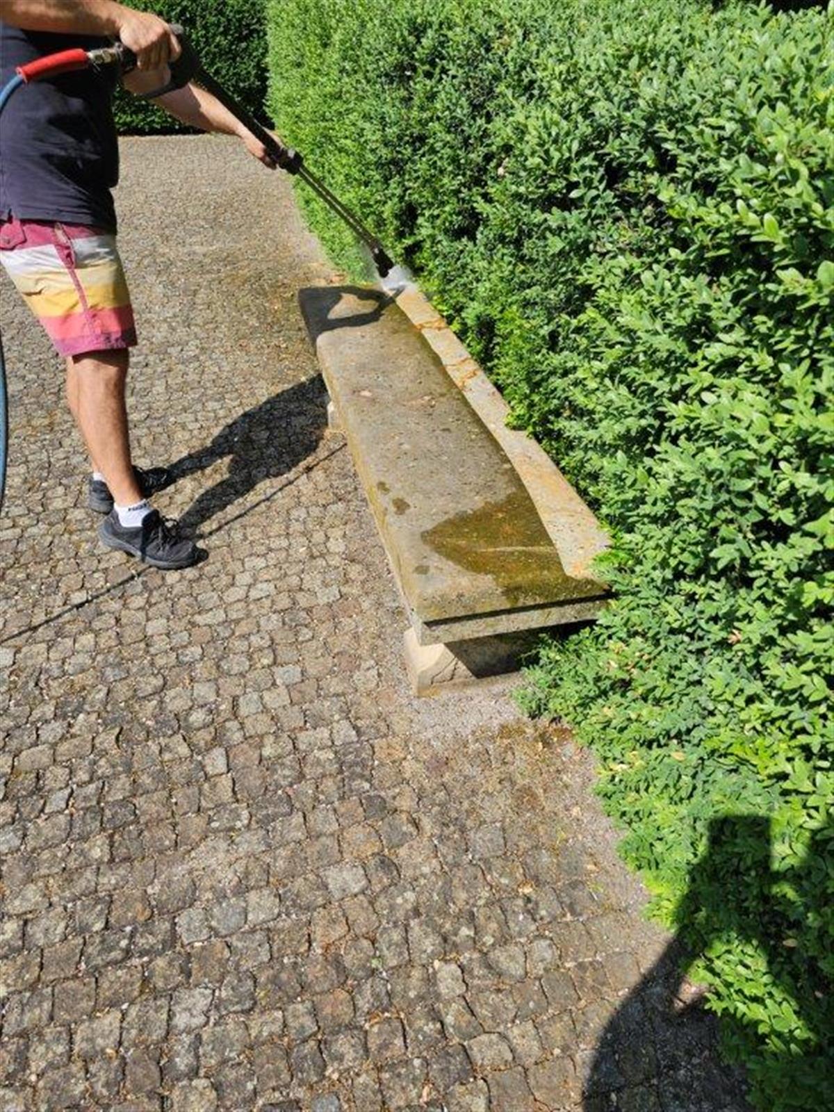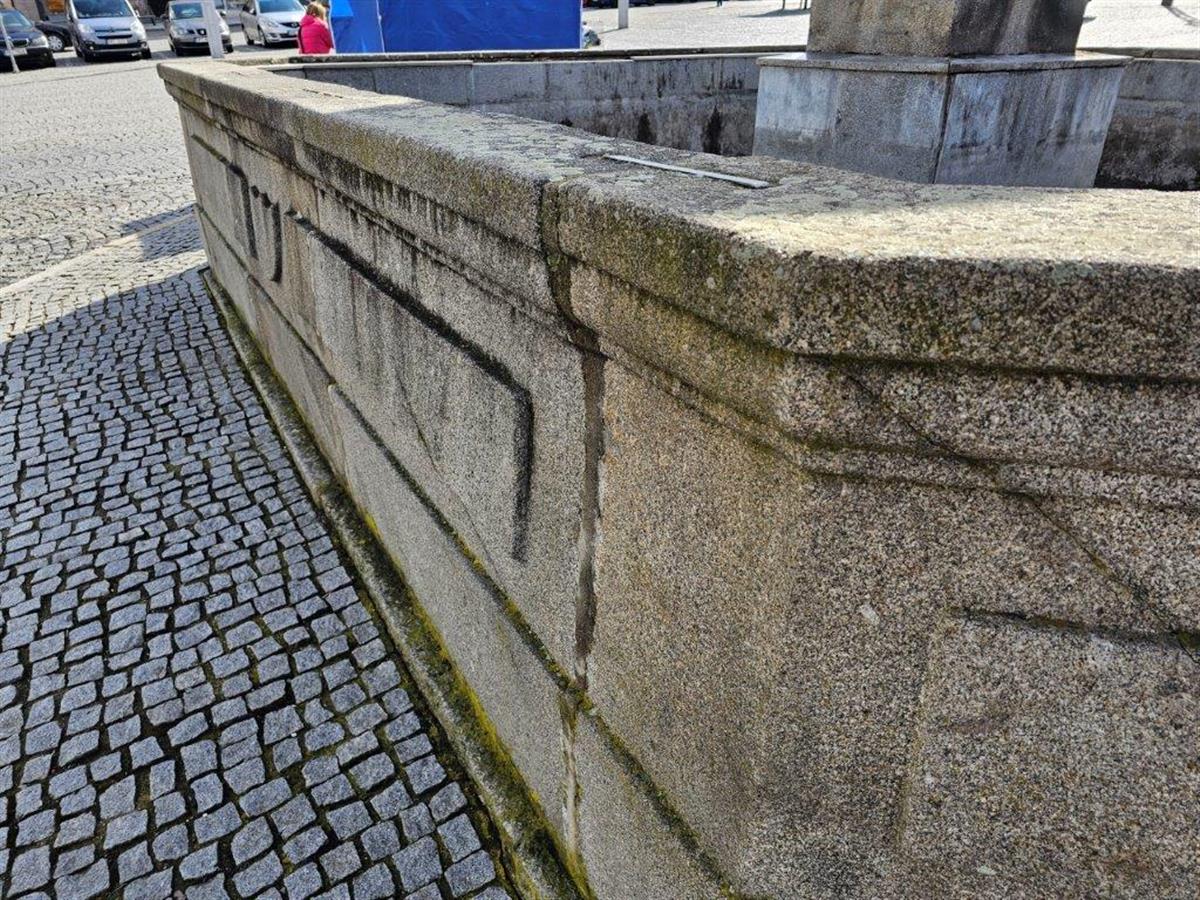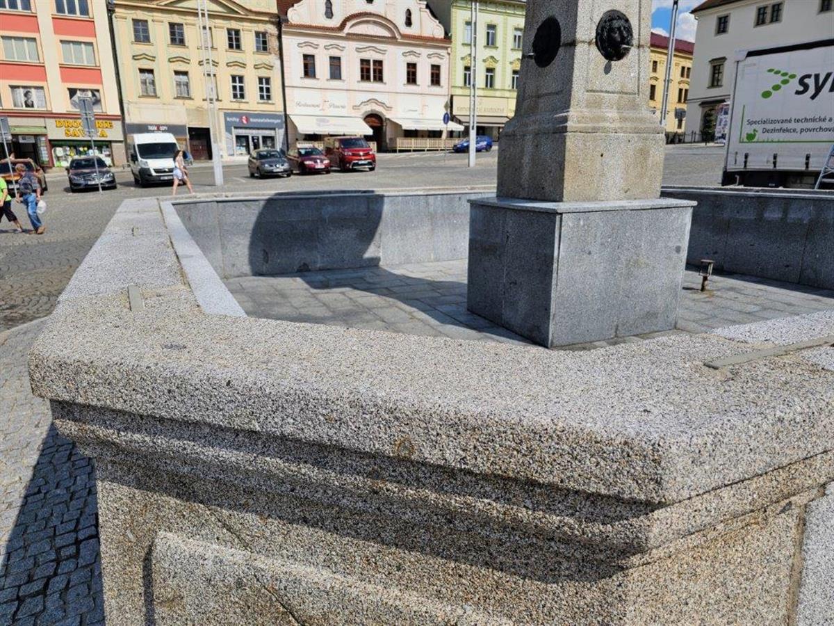 Tlakové čištění žulové kašny na klatovském náměstí a laviček okolo „labyrintu“ za Černou věží. - 16.6.2023