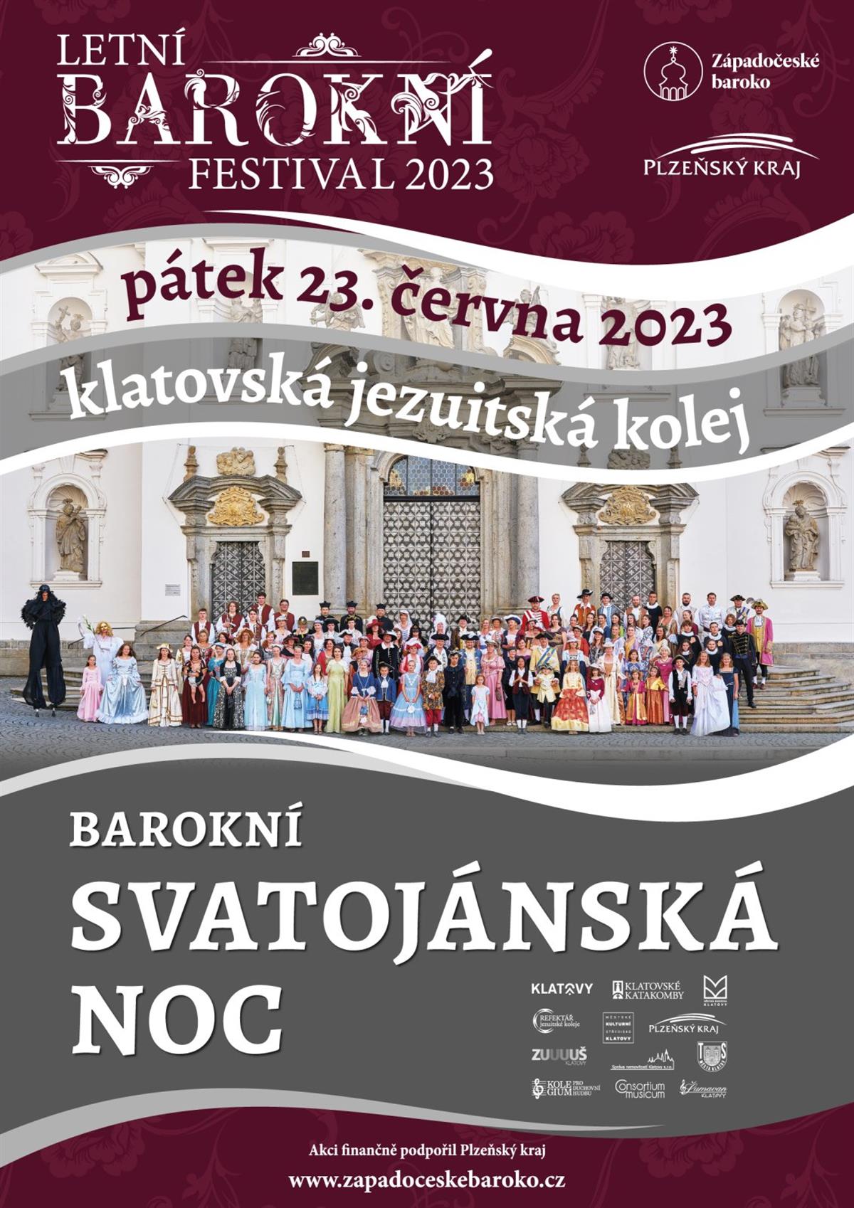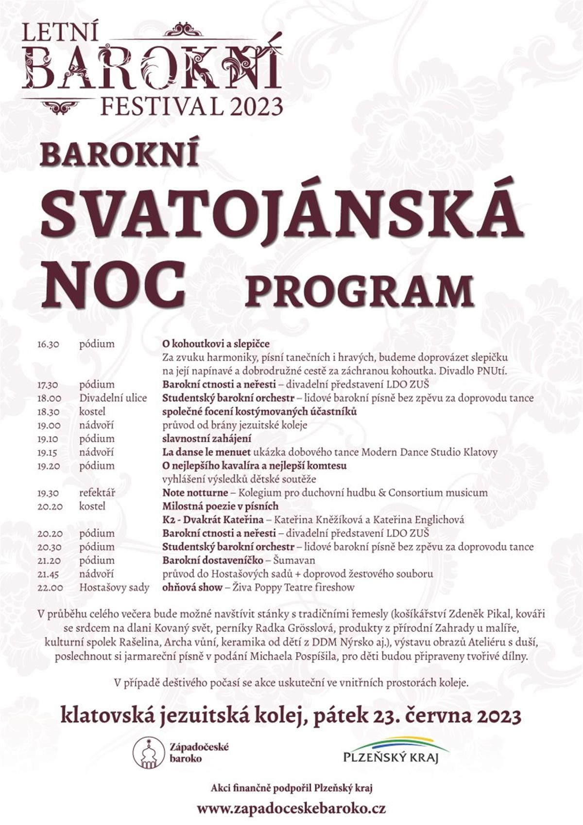 V 19.00 projde průvod v barokních kostýmech od brány na nádvoří, kde bude program slavnostně zahájen. Divadelní, hudební a taneční představení připravili žáci a učitelé ZUŠ Klatovy. Zazní tóny barokní hudby v podání sboru Kolegium pro duchovní hudbu a orchestru Consortium musicum. V jezuitském kostele zazní Milostná poezie v písních Kateřiny Kněžíkové a Kateřiny Englichové. V průběhu celého večera bude možné navštívit stánky s tradičními řemesly (košíkářství Zdeněk Pikal, kováři se srdcem na dlani Kovaný svět, perníky Radka Grösslová, produkty z přírodní Zahrady u malíře, dřevěné dekorace Ivoš Zelený, kulturní spolek Rašelina, keramika od dětí z DDM Nýrsko aj.), výstavu obrazů Ateliéru s duší, poslechnout si jarmareční písně v podání Michaela Pospíšila, pro děti budou připraveny tvořivé dílny. Barokní svatojánskou noc zakončí ohňová show v Hostašových sadech.