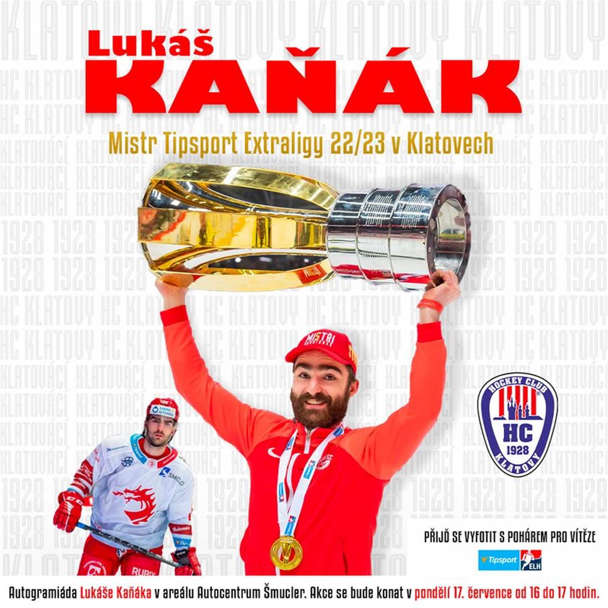 Klatovan a odchovanec místního HC Klatovy Lukáš Kaňák se stal v dresu Třince mistrem České republiky. V pondělí 17.7. 2023 od 16:00 do 17:00 hodin v Autocentrum Šmucler budete mít jedinečnou možnost se vyfotit s pohárem vítěze Extraligy, nechat si podepsat kartičku, nebo potěžkat mistrovskou medaili.