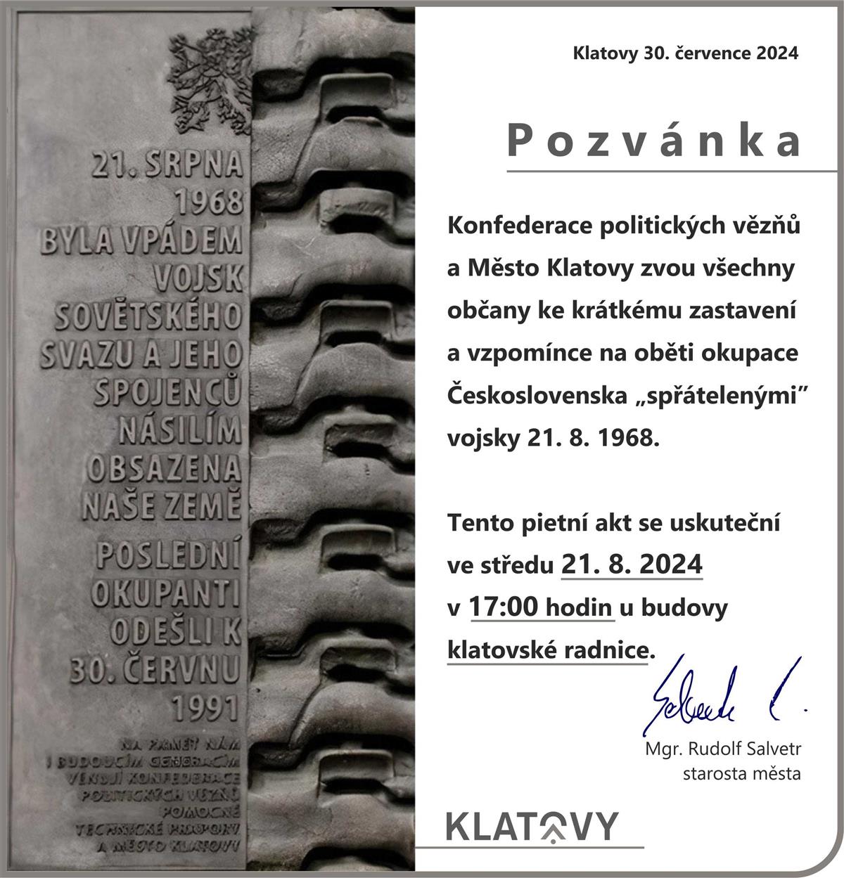 POZVÁNKA KE VZPOMÍNCE NA OBĚTI OKUPACE 21. 8. 1968 | Městský úřad Klatovy
