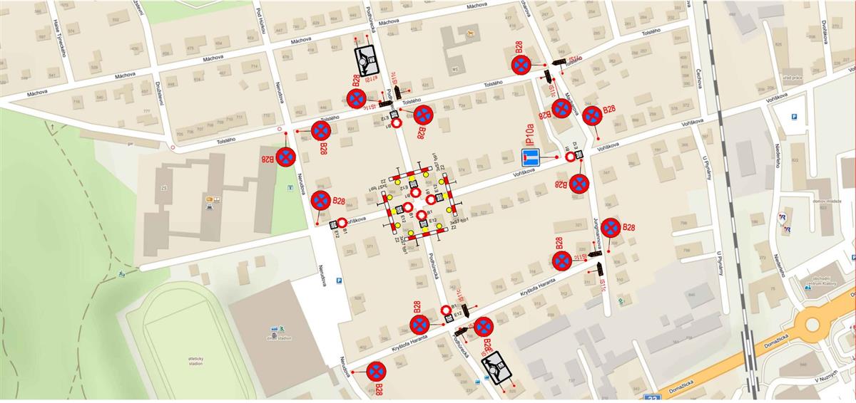Z důvodu výstavby nové okružní křižovatky Podhůrecká – Voříškova byly dočasně zrušeny v obou směrech autobusové zastávky Podhůrecká (u prodejny), Podhůrecká (pod stadionem), Zahradní a u Škodovky. Náhradní zastávky jsou v ulicích Čechova a Voříškova.
