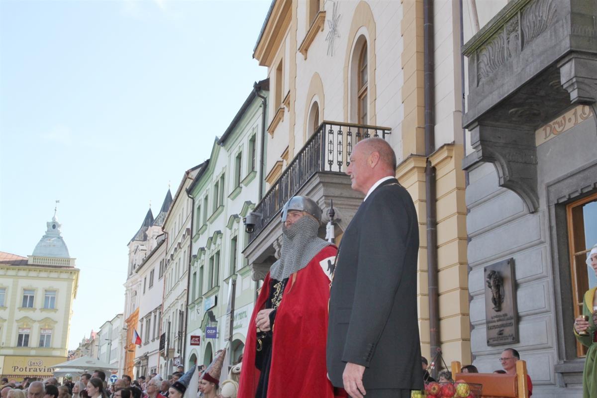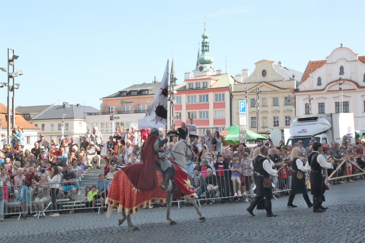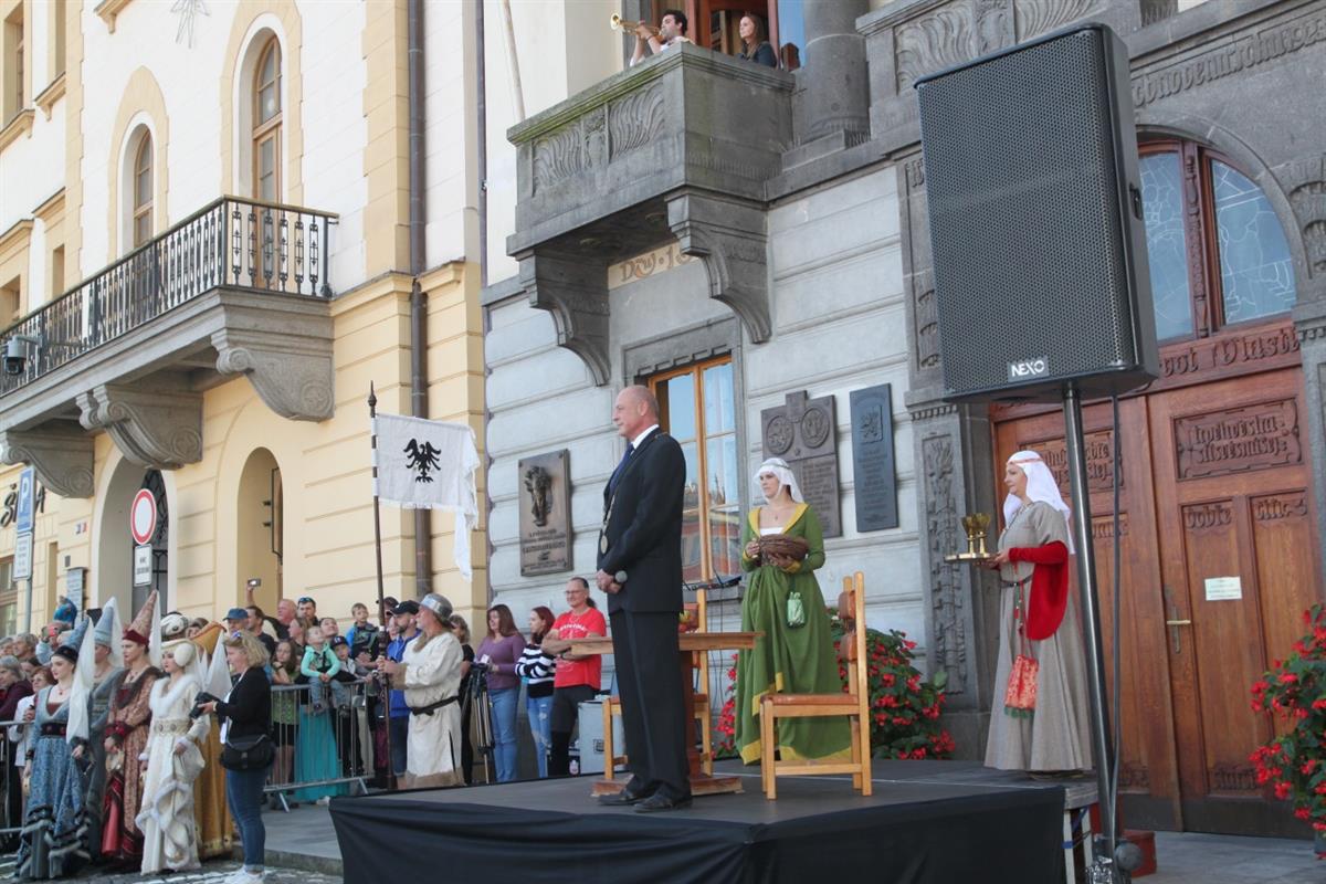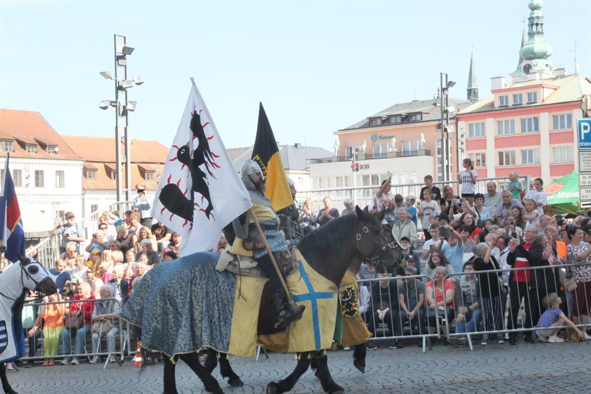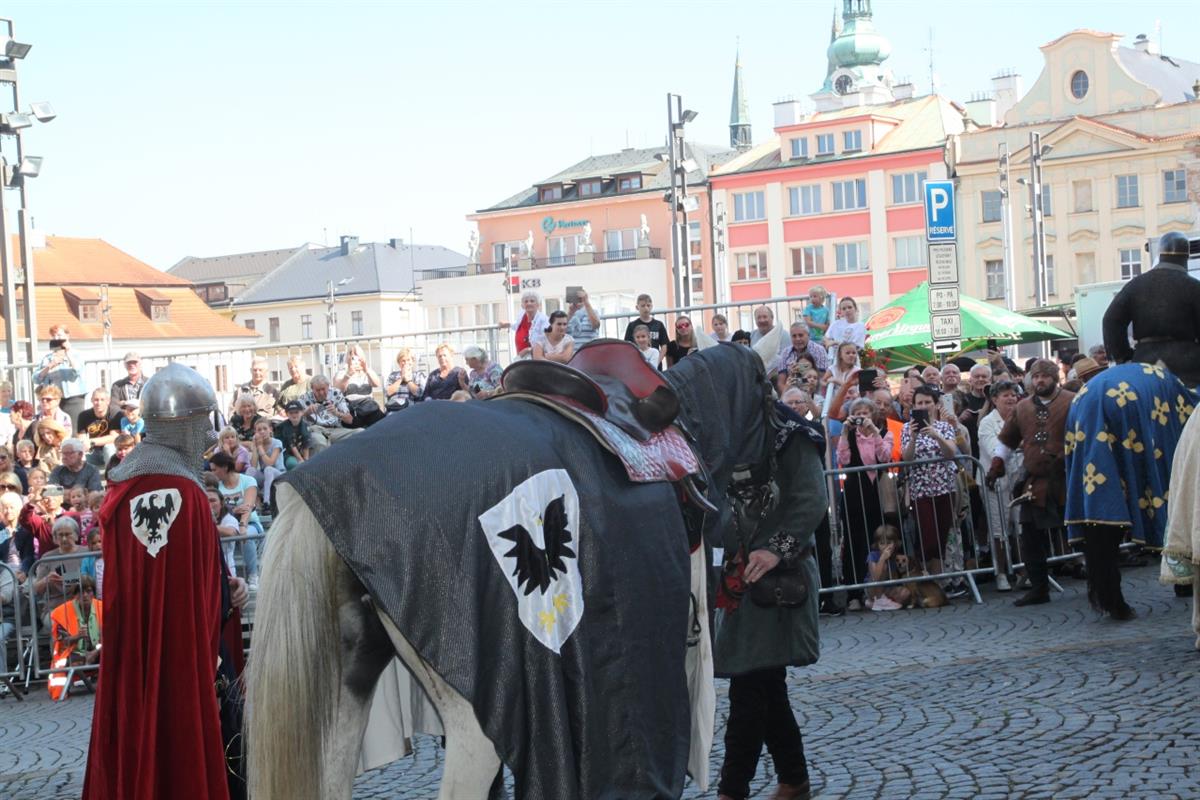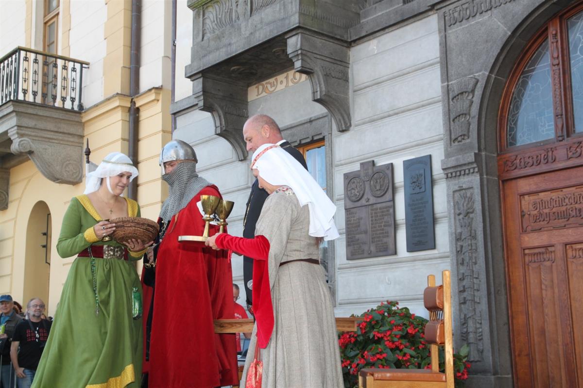 Stovky lidí, které v pravé poledne obklopily náměstí, vítaly za zvuku zvonu Vondra knížete s početnou družinou 🐴. Po napínavém rytířském souboji před radnicí přivítal svatého Václava starosta města Klatov pan Rudolf Salvetr.