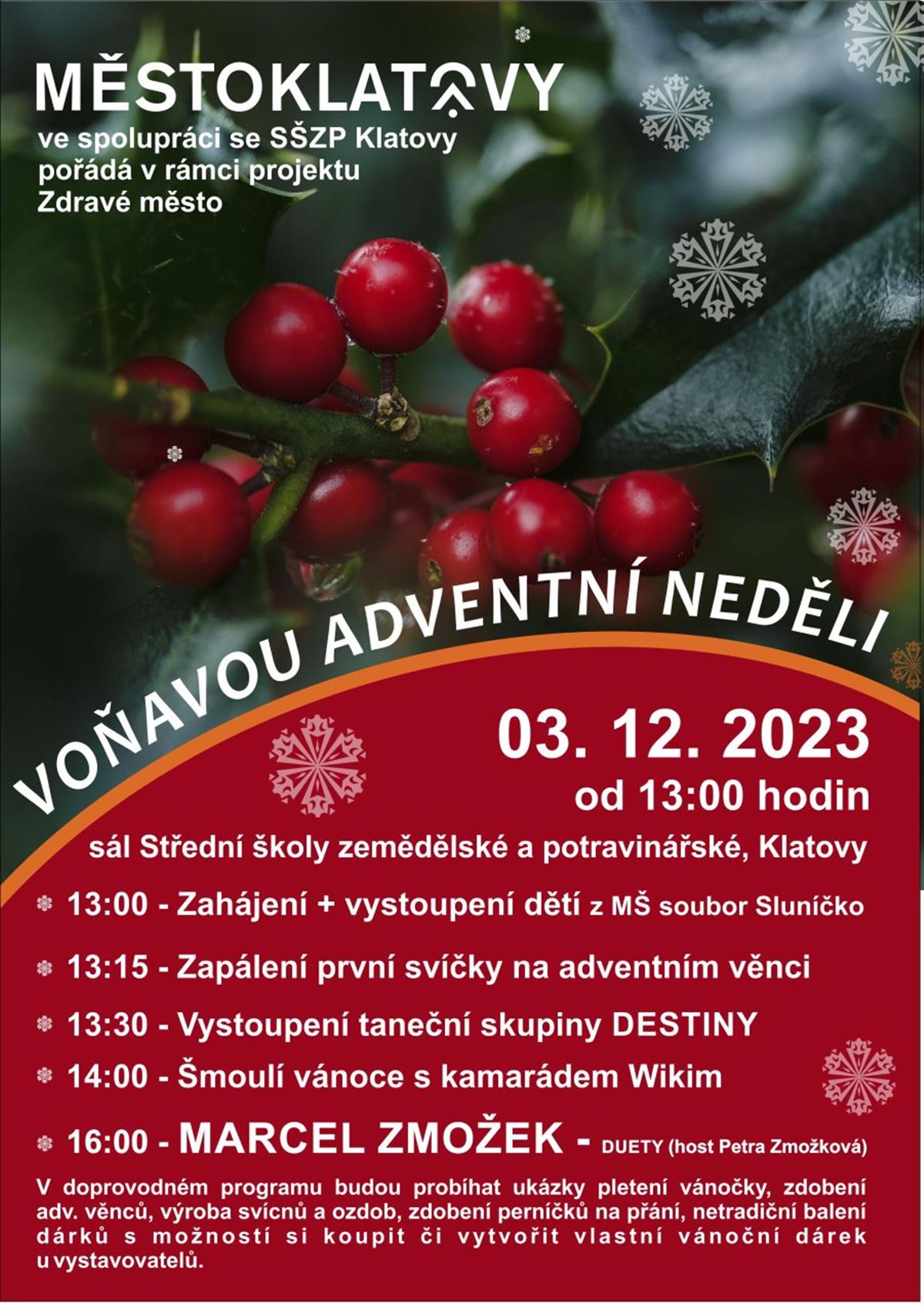 Obsah stránkyVoňavá adventní neděle - 3.12.2023SubmenuMěsto Klatovy ve spolupráci se SŠZP Klatovy pořádá v rámci projektu Zdravé město "Voňavou adventní neděli" - 3.12.2023 od 13:00 hod. v sále Střední školy zemědělské a potravinářské, Klatovy. Návrat na předchozí stránku