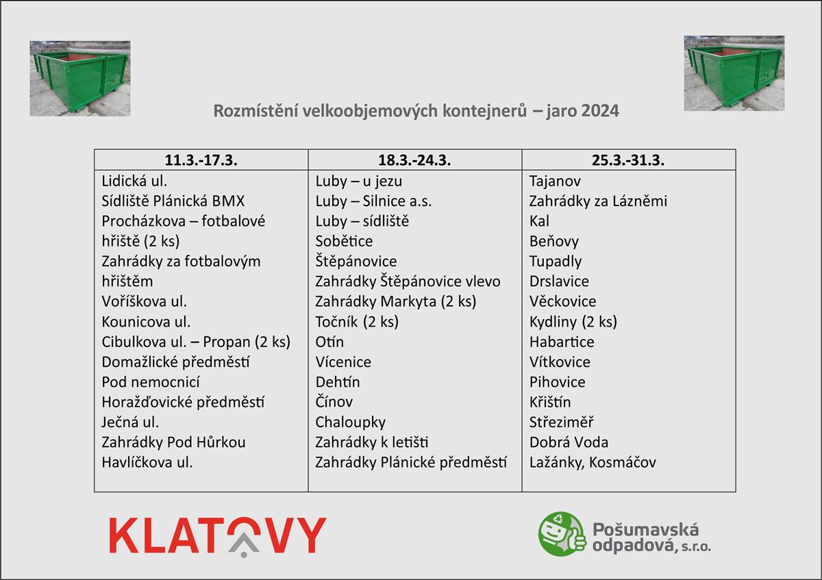 Město Klatovy upozorňuje občany města na rozmístění velkoobjemových kontejnerů (VOK) v období od 11.03. do 31.03.2024 na území města a v integrovaných obcích na označených stanovištích dle níže uvedeného rozpisu.