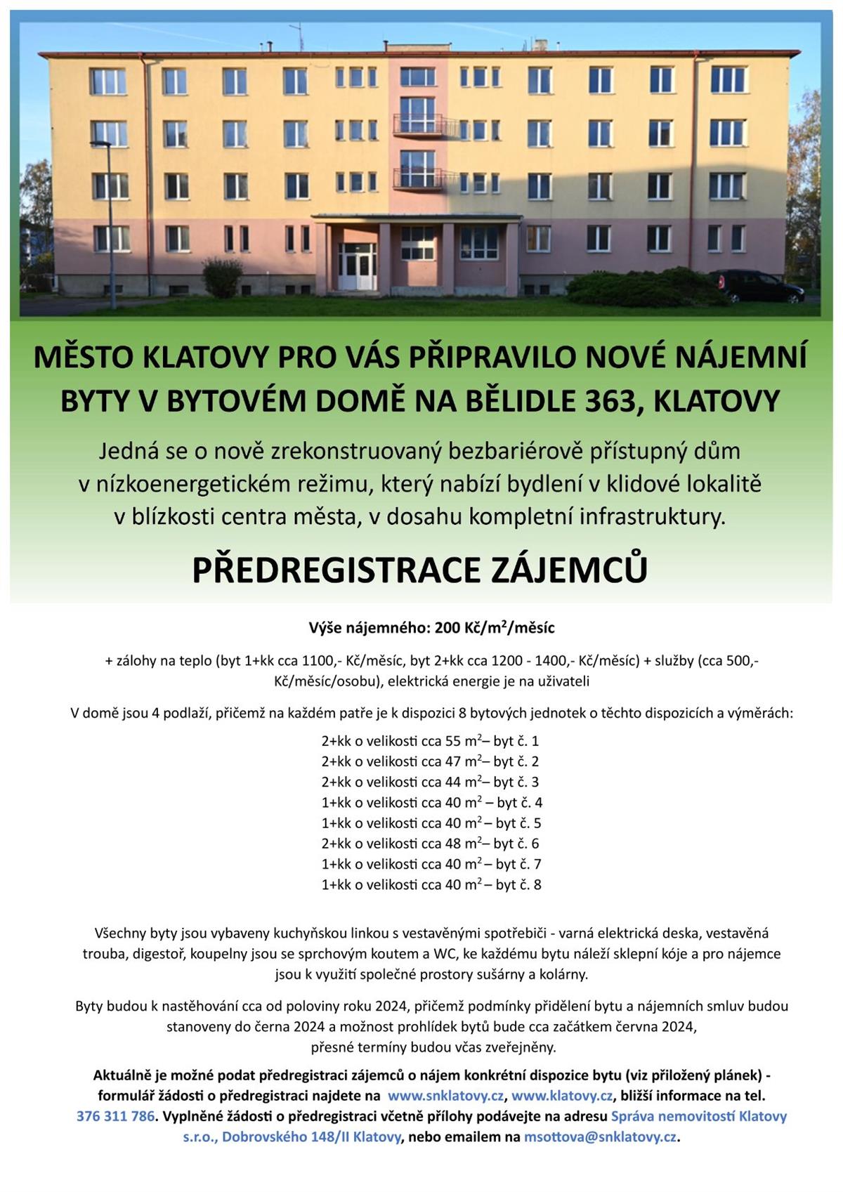 Předregistrace zájemců o nové městské byty k pronájmu v bytovém domě Na Bělidle 363