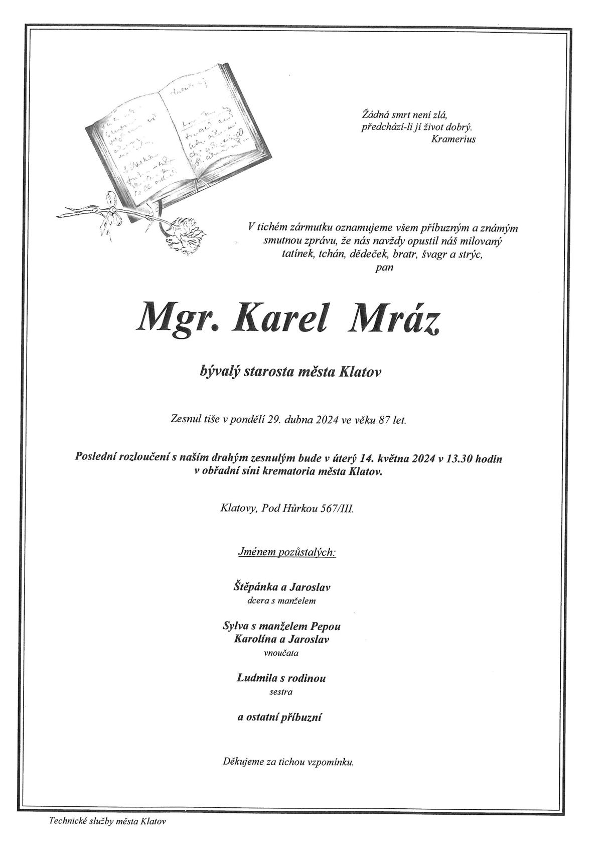 V pondělí 29. dubna 2024 nás navždy opustil ve věku 87 let bývalý starosta města Klatov pan Mgr. Karel Mráz.