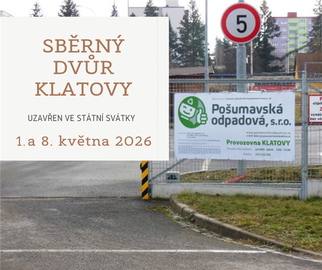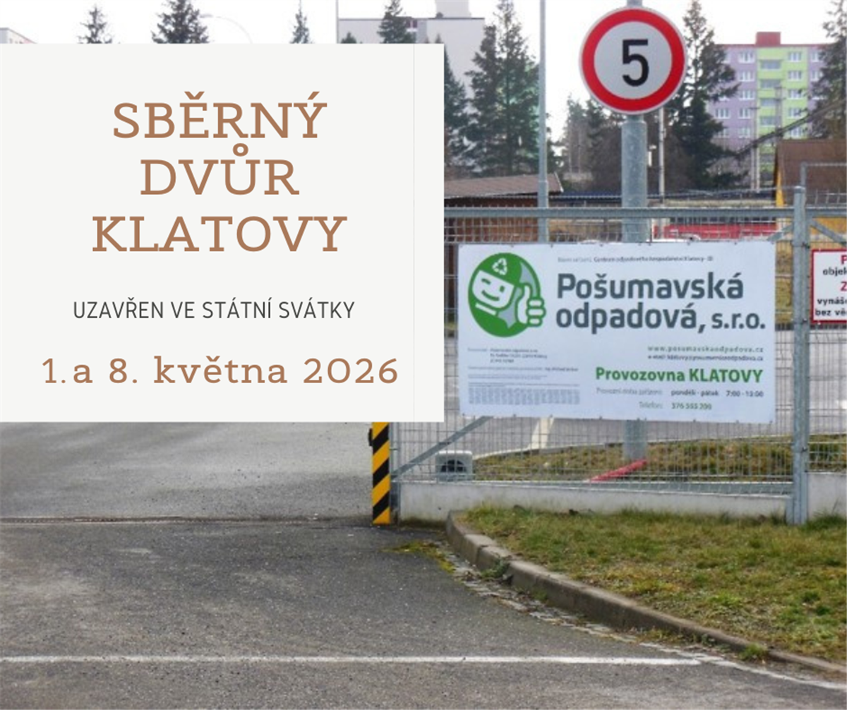 Obsah stránkyKlatovský sběrný dvůr bude ve státní svátky 1. a 8. května 2026 UZAVŘENSubmenu❗️Klatovský sběrný dvůr bude ve státní svátky 1. a 8. května 2026 UZAVŘEN❗️Návrat na předchozí stránku