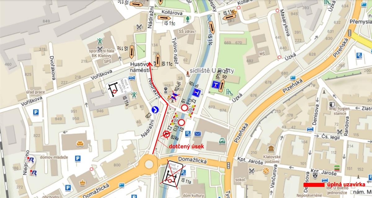 🔹 Uzavírka se týká směru od kruhového objezdu na Domažlické ulici na Husovo náměstí.